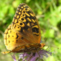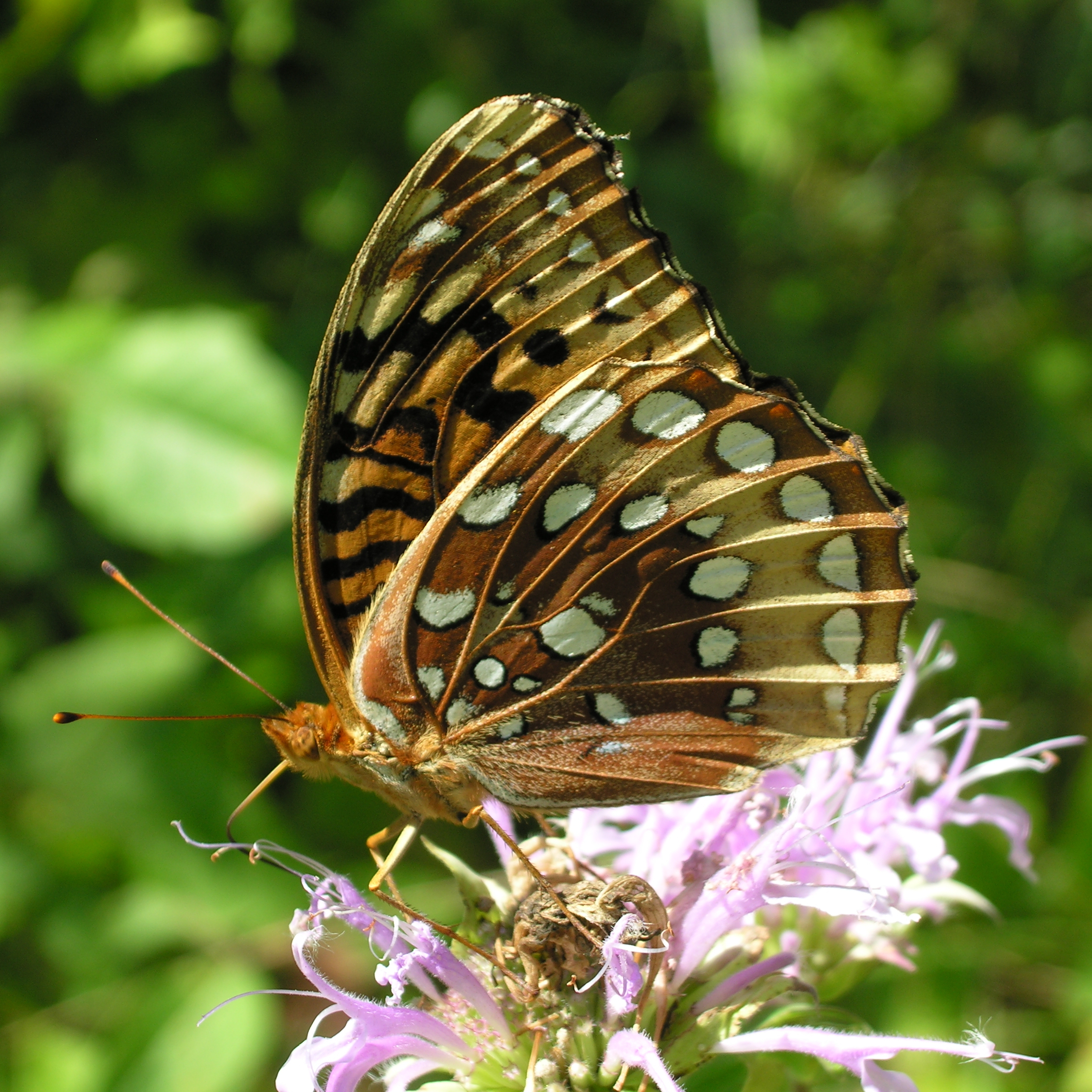 Fritillary, of some sort, I do believe. Since the same three monarda flowers pretty much serve for the rest of the series, they give a sense of scale. Thus, this butterfly, while respectably sized, can't match the majestic swallowtails.1/160s, f/4.9 28jul05, 12:29pm