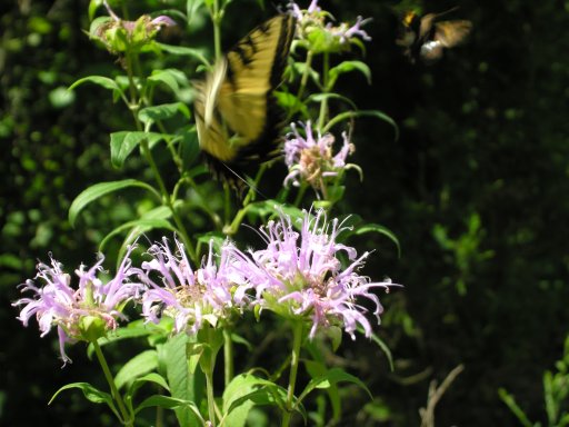 This patch of monarda at the #1 trailhead proved to be superb for attracting flying fauna...I rather like the way the flowers are in sharp focus, but the butterflies’ wings are blurred. 1/204s, f/4.9, 10:31 in the morning.