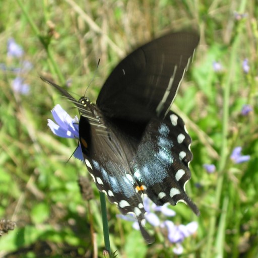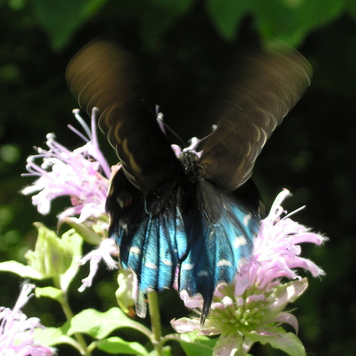 At first I just assumed this was the same species as the black swallowtail, above. Then I noticed how much more blue it has on its lower wings, and figured I'd shot something different. It still has the white spots, so maybe the pattern is more variable than, say, for monarchs.[2] At any rate, I like the way the upper wings blurred a bit, reminding of similar butterflies I shot in Vietnam (but have yet to post.)
