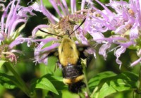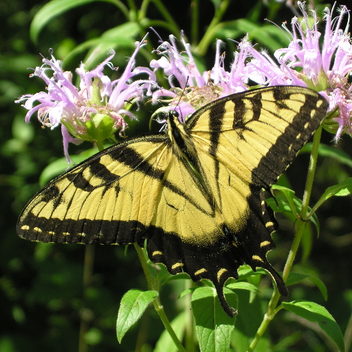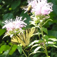 I shot the bulk of these pictures while parked at a patch of monarda near the trailhead of trail #1. After standing there awhile, the insects got used to me, and allowed me to get close to photograph them. This was a case in which brilliant mid-day sun worked to my advantage—it helped to freeze the motion of the animals somewhat, but the macro-focus kept from washing out their color (because you need a lot of light when the lens gets very close to the subject), and the short depth of field rendered the background suitably unobtrusive. All the images were taken with a coolpix 8400 set to fine (highest .jpg) quality, white balance to fine (sunny), aperture priority.