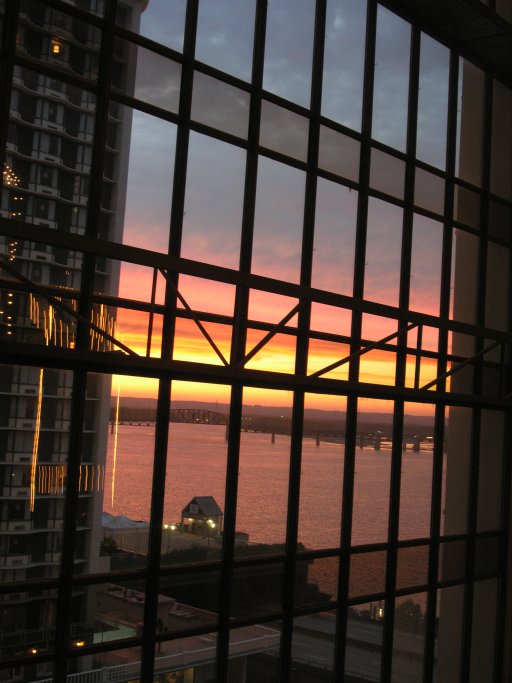 A shot out the window next to the elevator. (The moving lights are a reflection of an elevator, in fact.) The bar was an aquarium, and there were also a couple of enclosures with colorful weaverbirds; the area behind the registration counter was a subtle waterfall. So the hotel had interesting decor.