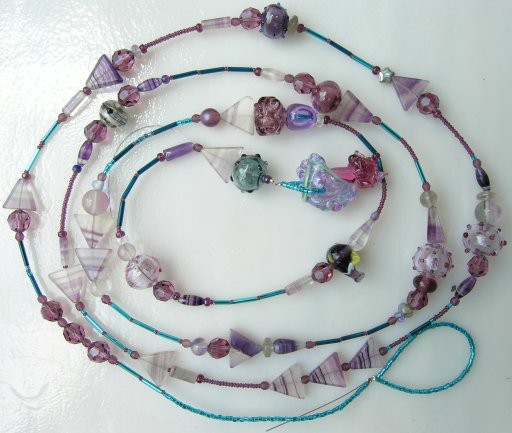 Bead curtain strands are all about using up bad beads, and fluorite, though it comes in lovely purple and green stripes, is extremely soft, and scratches and breaks too easily for it to make good jewelry, in my not-so-humble opinion.