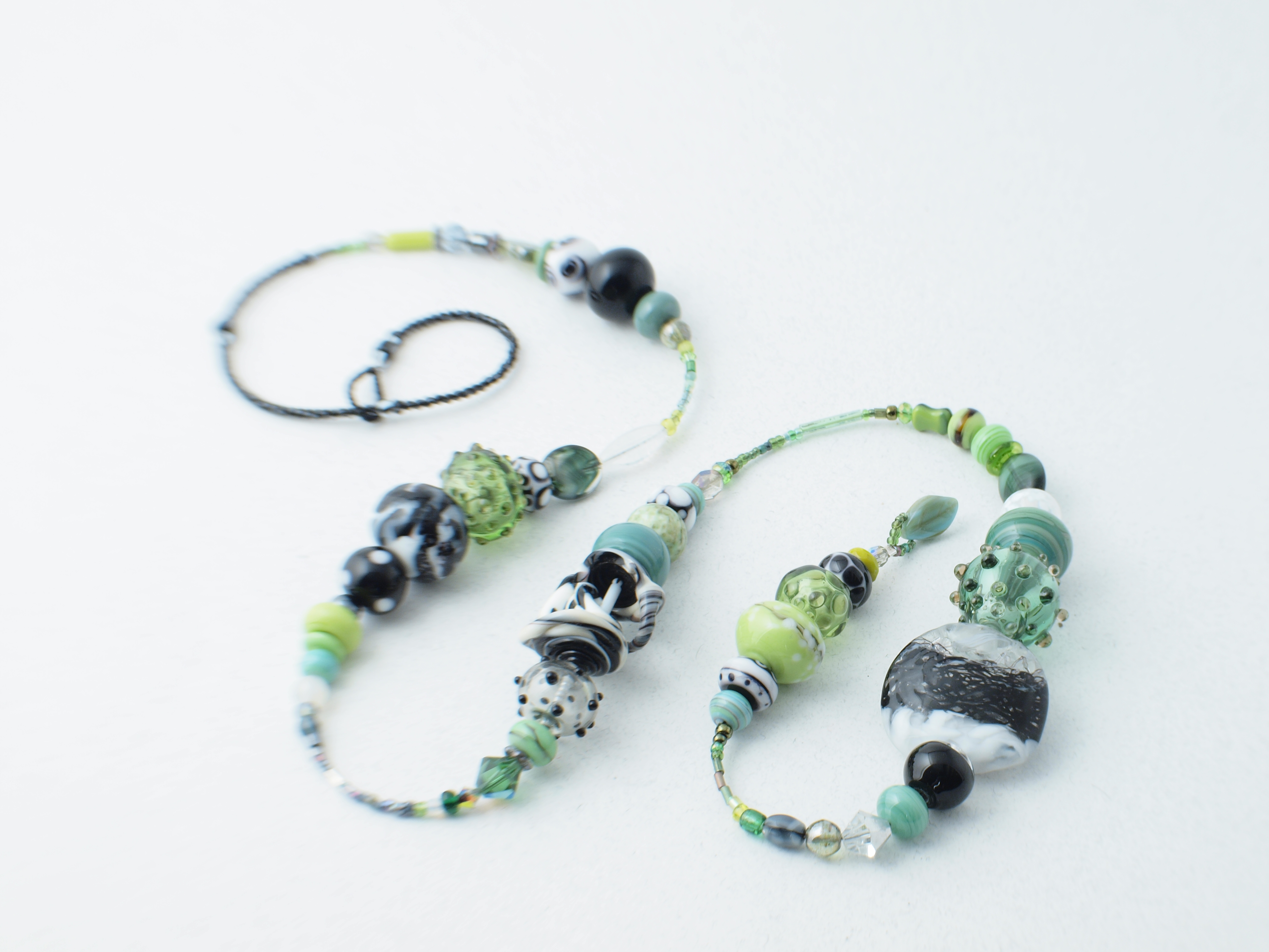 This is a custom bead strand, mixing opaque and transparent beads. The designs of the main two sequences (i.e. the two rightmost, featuring black & white focals) are based on the customer's design. He selected some more beads to fill out the piece, which I then strung.