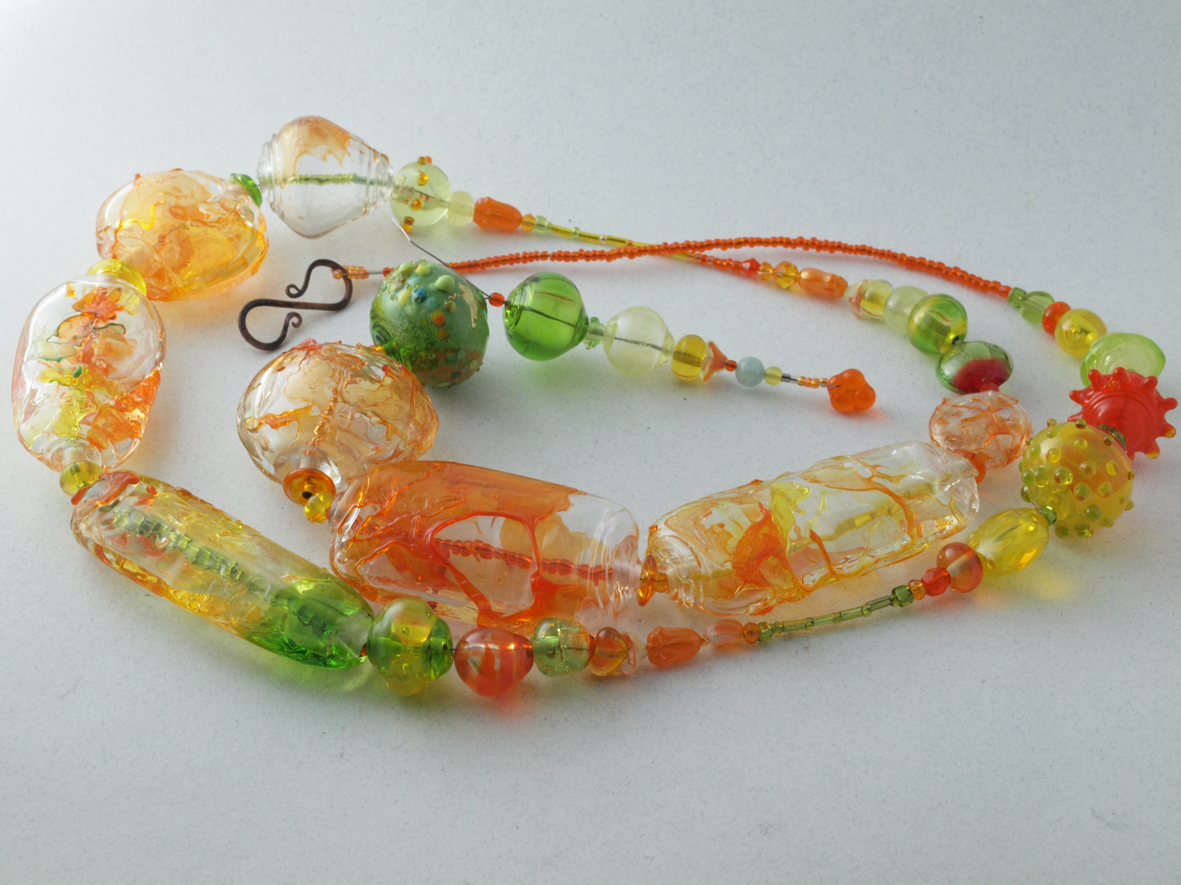 I've been playing with a mix of techniques—shards, frit, thompson enamels and floral trailing—on top of pressed hollow beads for awhile. With the beads for this project, for which I needed transparency, I backed off the enamels and floral trailing, eventually cut out the frit, using only shards. Originally, of course, I thought simply to make a lot of orange (& yellow) transparent beads, as I usually do for bead curtain strands.