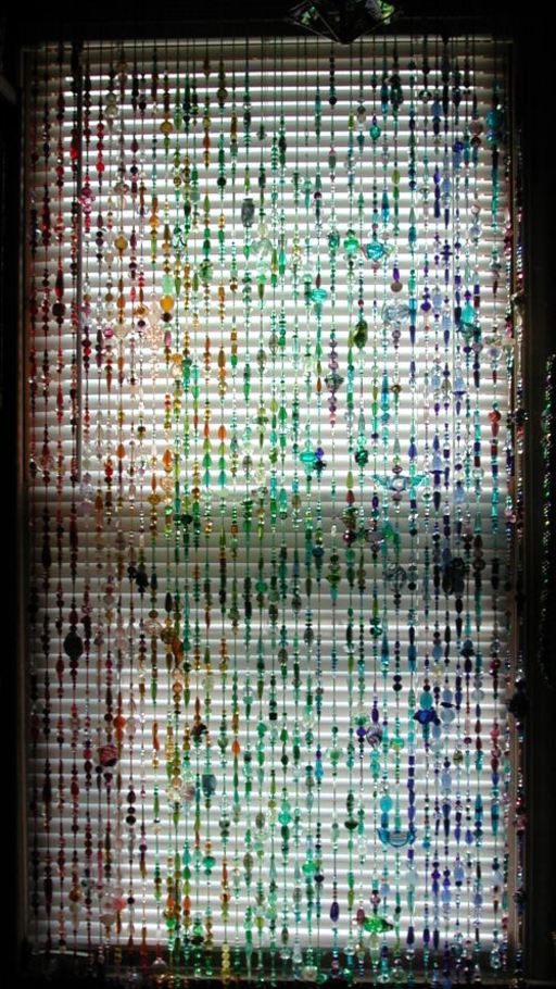 I decided a bead curtain would be just the thing to use up a lot of beads. Their imperfections wouldn't matter in the distance, and if a cracked one occasionally broke, the pattern would still be good enough. Bead curtains are often traditionally hung in doorways, but I don't have any suitable ones, and besides, given that many of the beads were extremely fragile, I wanted to hang them in an out of the way place. I selected a window, which has the added benefit of transmitting sunlight. Thus, I selected only transparent beads for this project, since most of the light is backlighting. As long as I didn't think a bead would immediately fall apart, it was fair game.