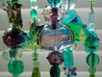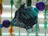 These beads are strung on 7 strand tigertail—another relic of my older days, before the advent of 49 strand beadalon. There are 41 strands, each about 60” long, plus 5–8” of seed beads at the top for hanging, a 1” diameter oak rod finished with tung oil and beeswax (because it was quick and lying around) In total the curtain weighs about 20 pounds. Most of the beads are soda lime, though there are a few borosilicate beads, badly blown, and some lead ones, including a great many satake purple that slightly melted together in the kiln. Though I probably spent only 80 hours or so stringing the beads in the freeform patterns my partner and I call “fantasy”, I've been working off and on this project for over a year (I had to periodically collect more bad beads.) I get email about the bead curtain, so I've added a FAQ page