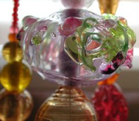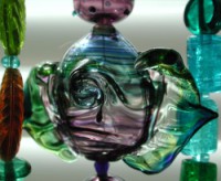 This is a much earlier bead, a dichro core with floral decorations. Beautiful bead, but core beads—cylinders with a hollow bead built around them, also tend to crack very readily, as the mandrel sucks heat out of the core while the outer jacket stays hot. They commonly crack right at the juncture of core and outer bead. Add trailing to the mix, and again, if they don't crack, they pop.