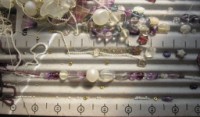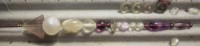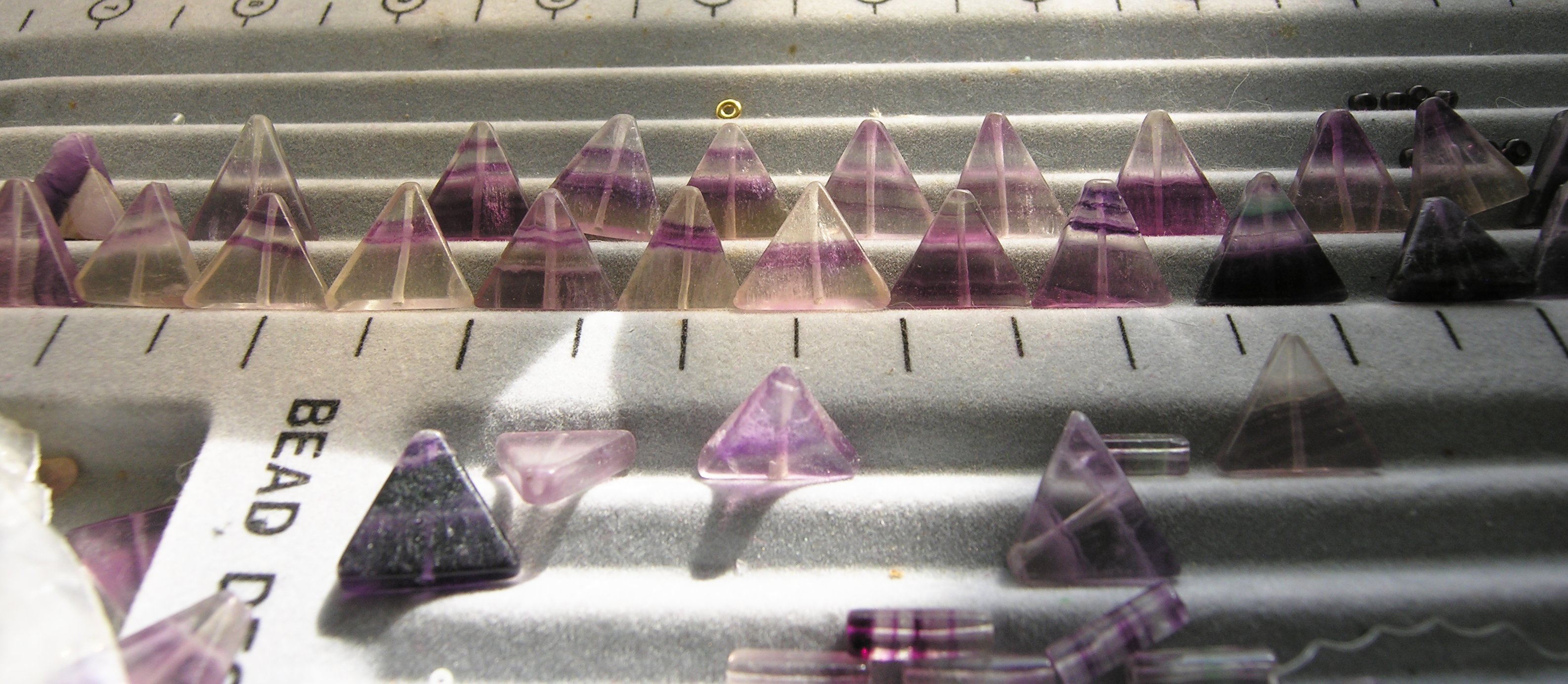 This sequence, which is definitely on the long side, is somewhat misleading because the fluorite triangle just underneath the white pixie is tipped up on its side; thus it looks more like 4x12 rectangle. It isn't. (I couldn't resist showing the chaotic way I actually string, which is why the photo shows more of the surrounding mess.) The sequence starts with a straightforward buildup of sizes, starting with a (perhaps) 9/0 seed, a 3mm czech, a 4mm 5301 austrian crystal, a 6mm, some chips to “slow down” the increase, an 8mm, a 10mm, the 16mm triangle, a 4mm purple, which both in its contrasting hue, much darker value and small size briefly pauses the eye, before going on to our main focal the big pixie. On top of the focal, the decrease back down to seed bead size is slowed down by the use of the large oval, the 6x16 s-curve, plus numerous round beads, of which the 6mm clear colorless facet rondell just to the left of the 6x16 fluorite drop acts as a mild pause/constriction. Needless to say, it takes me a lot longer to articulate this than it does to string it...
