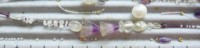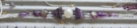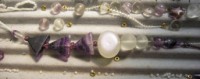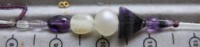 This pattern is kind of interesting because it has no clear focal bead, but rather two sets of large beads—the 3 16mm triangles to the left (bottom, remember) and three white beads of decreasing size on the right. In fact the whole right sequence is in effect a giant triangle, with the greenish, light fluorite disk serving as shape and value transition to the purple 8mm round and 7x16 drop. Now, for extra credit what bead in this pattern really doesn't belong? That's right the 4x16 oval: it's not really integrated into the rest of the design. I do however like putting beads in threes, and since I easily had a strand's worth of triangles, felt free to use them in luxurious, happy abandon.