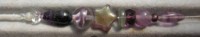 An absolutely typical design, that starts with a 4mm to transition from the seed beads, rapidly increases (by way of a faceted rondell) in diameter, a slight constriction (built in as it were) by way of a 6x16mm drop, thence to our secondary focal, a 10mm purple moon, to a 12 or 14mm star our main focal by virtue of its greatest size and unusual shape. Once again I use a disk to set off the top point of the star, coupling it with a 8mm facet rondell and 8mm round. Note that these three beads taken together echo and mirror the teardrop below. I had so many good shapes at this point that making this was like taking candy from a baby. We finish off with a minor constriction (the 4mm purple) and finally a 4x12 oval, which transitions us back to the seed beads and “weights” the focal towards the bottom of the sequence. This is very typical of my bead-curtain design.