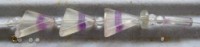 Getting to light at the end of the tunnel, or at least strand, here. This simple pattern has a lot to recommend it—just a 4mm and 6mm fac rondell to set up the focal area (the three tris) with again a larger disk and 4x12 rectangle inserted on the reverse to elongate the top (right side) of the design. The 4mm crystal rounds spacing the tris are not absolutely necessary but they help to visually pop the tris and tie the 4mms on either end into the pattern. Note again that I've taken the trouble to choose three similarly striped tris to emphasize the rhythm. Not shown is the 4 or 3mm round that no doubt was strung to the right of the rectangle.