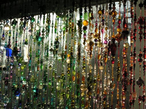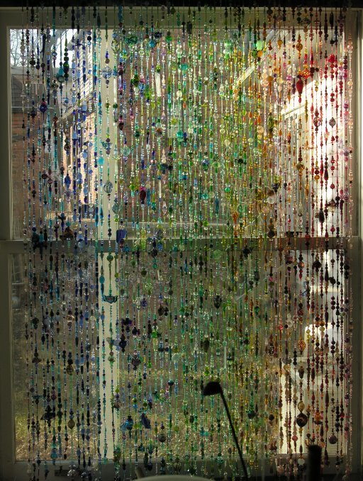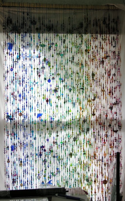 Bead curtain. Roughly 20 new strands added for a total of 61 currently displayed (one is broken, awaiting repair); washed, rehung. 2006. Weight's presumeably up to 30#, since I've added a third again strands.