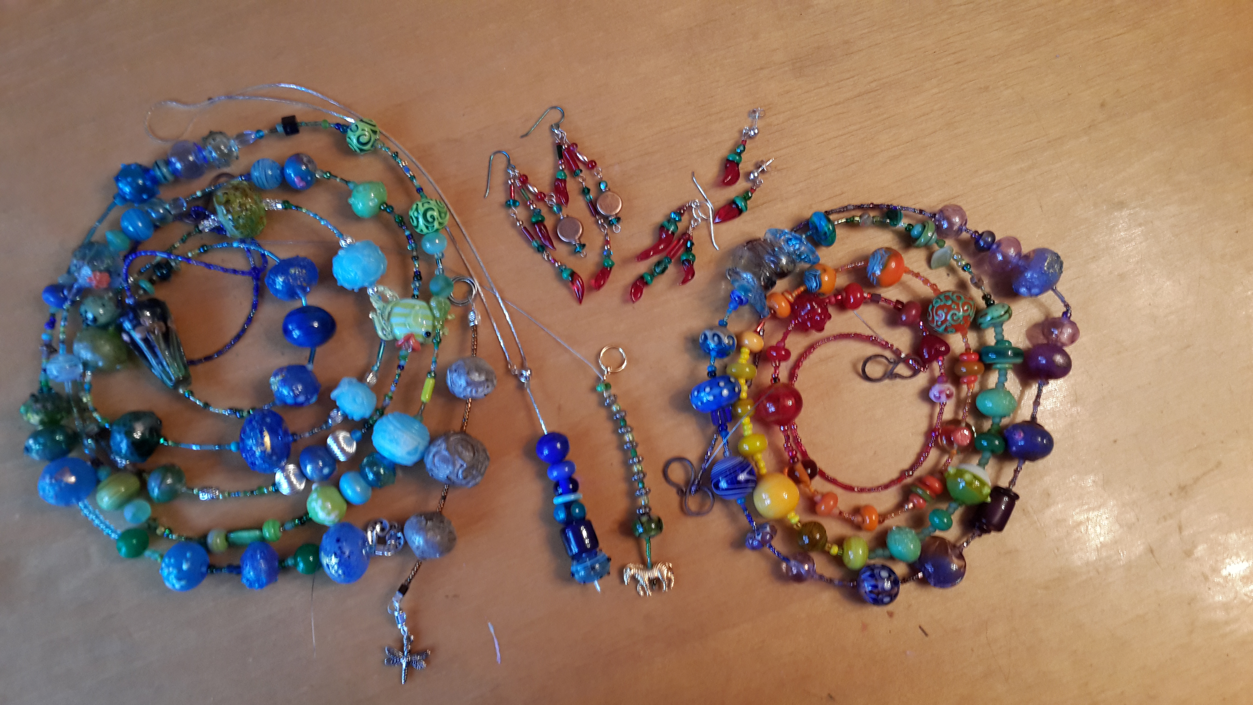 I don't actually recall these pieces—a couple of beadcurtain strands, a pair of charms? and 3 pairs of earrings made with what looks like leftover guild christmas beads. Pretty certain I made the earrings,[1] and equally so that I didn't make the strung pieces.