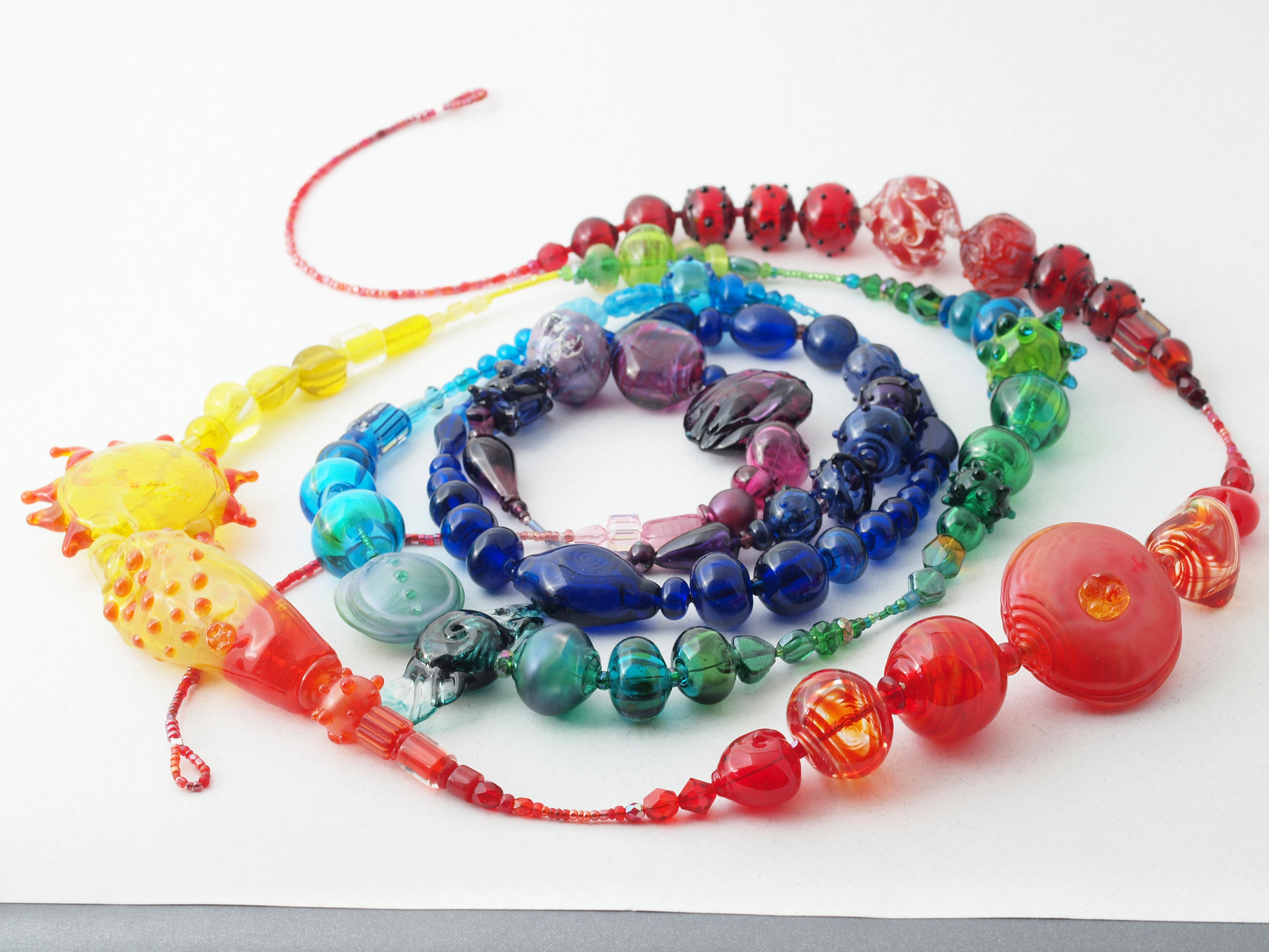 The artist who gave me the furnace glass that I incorporated in the bead curtain strands featured last week liked the idea and decided she'd like a strand, too. She liked the rainbow effect of my original curtain—she hangs a rainbow flag in a window by the front door—and so asked to do a complete rainbow in one strand.