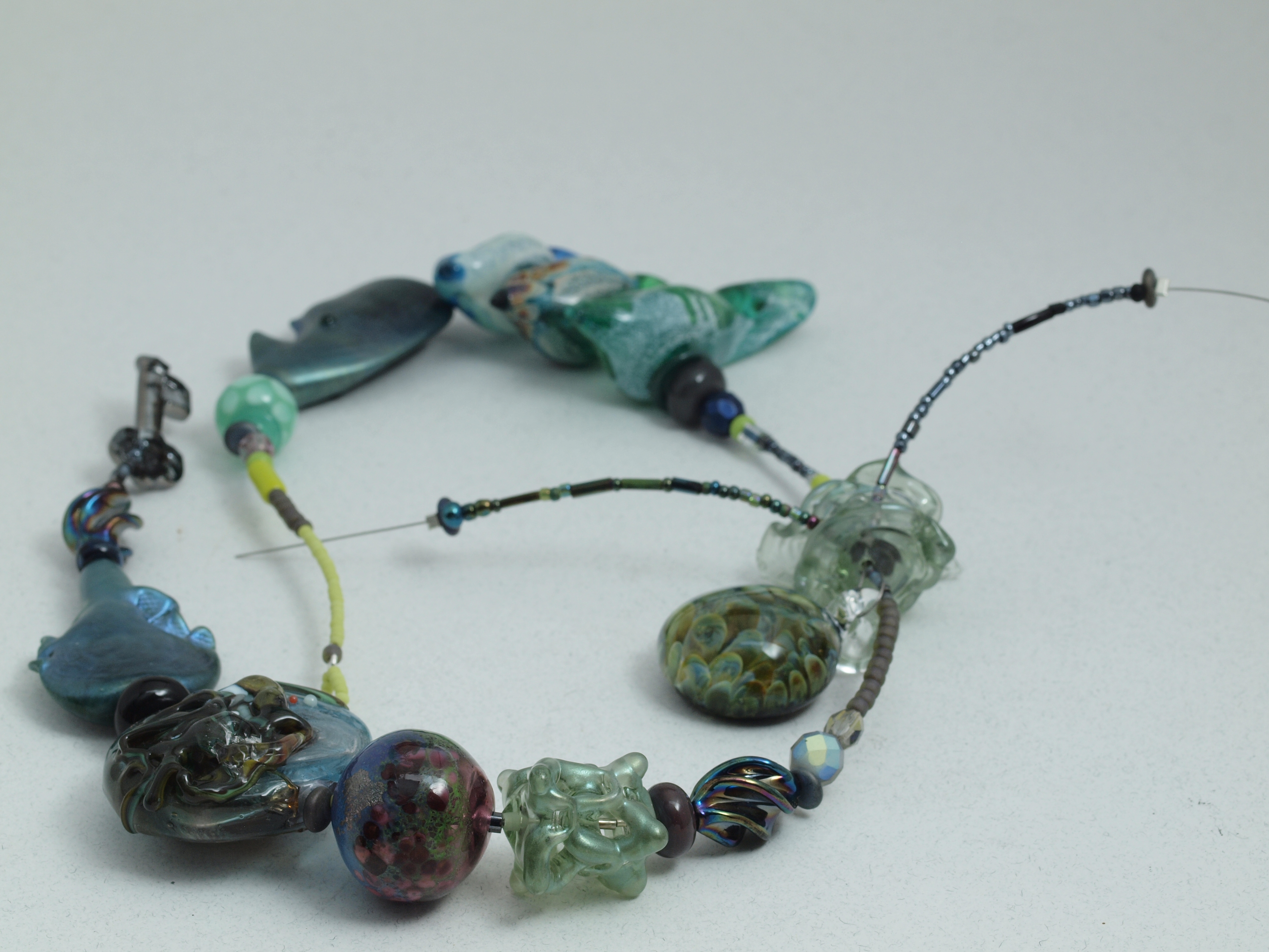 beadcurtain strand: boro pendant by frances ross, sodalime beads including 3 birdies as well as some opaque bullseye, swarovski key, beadalon, seed beads. 2015