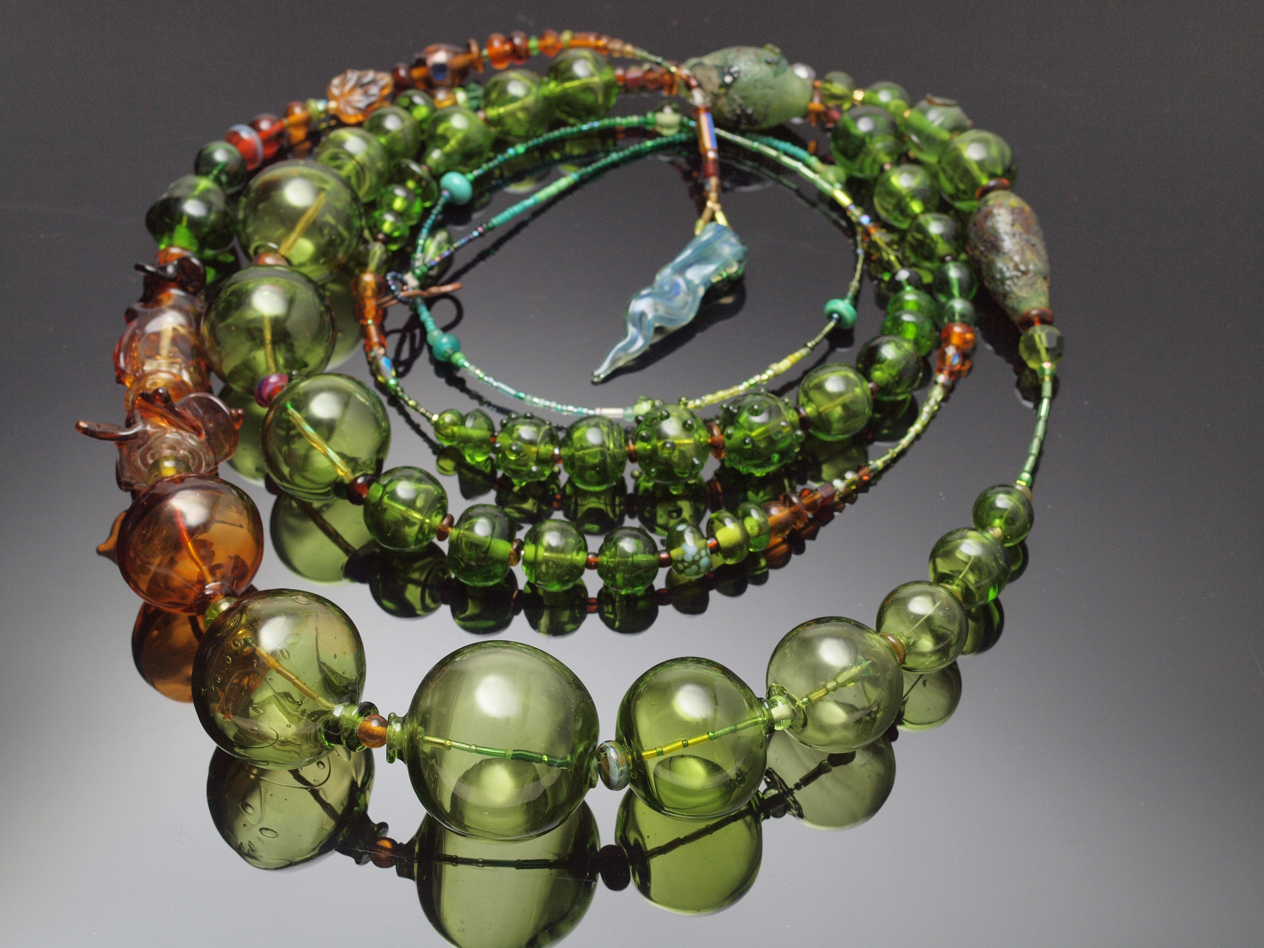 Ever since Davide Pennso demoed blown hollow beads I've wanted to master this technique, with the added caveat of making the blown beads reliably and evenly thick enough to be as durable as my mandrel wound hollows. So I have all this $5/lb green glass that I've been practising on for the last year or so. These beads aren't horrible but I don't feel they're quite thick enough to sell (though they all did survive being dropped 4’ onto a hardwood floor, so they're not totally unreasonable.)