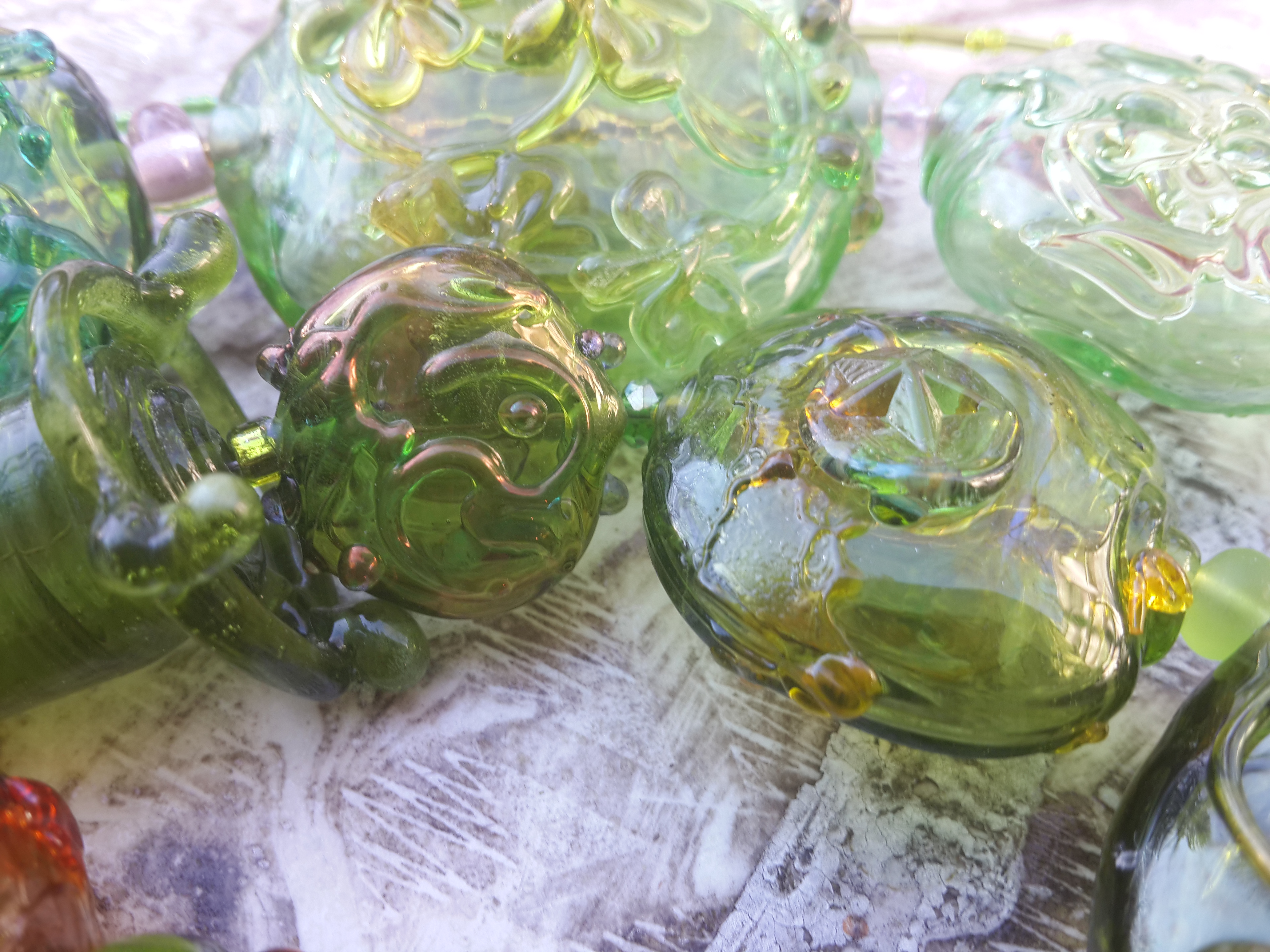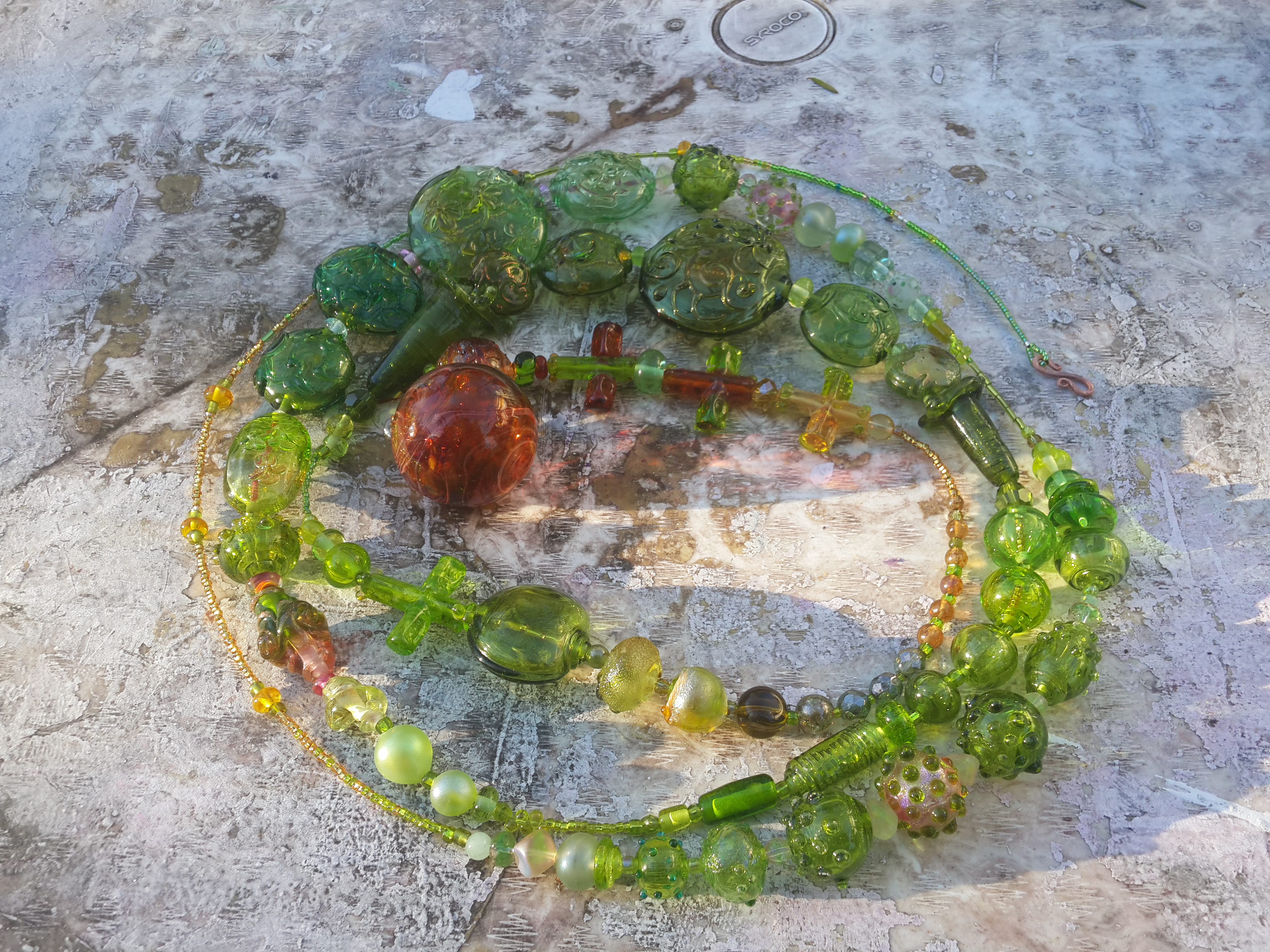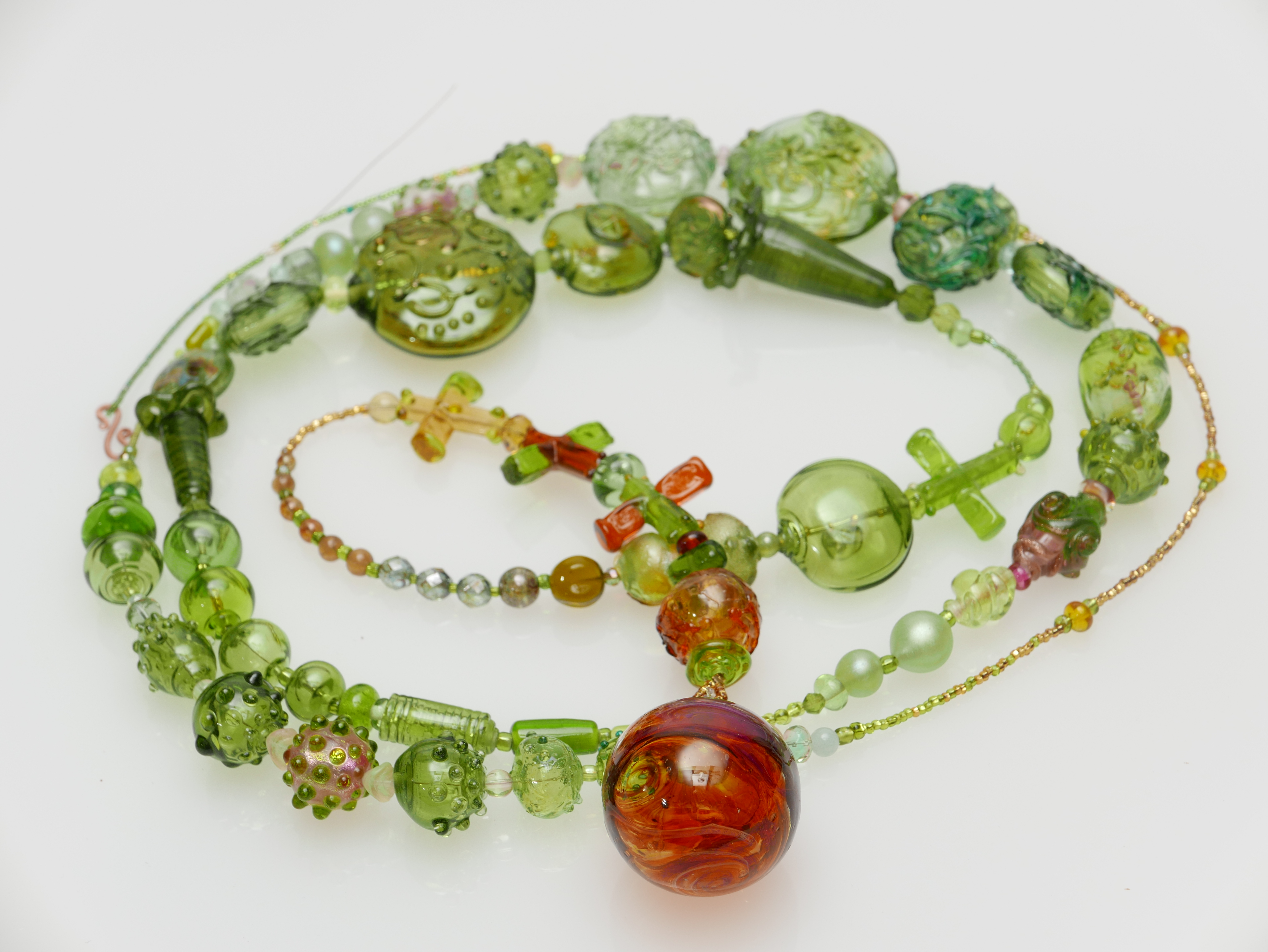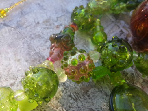 Rather than hiding them away, I decided I would like to have some of my first teacher's beads where I could admire them all the time, so I incorporated both some sputniks (the dichro core dotties) and twist/raked bicones into this strand.