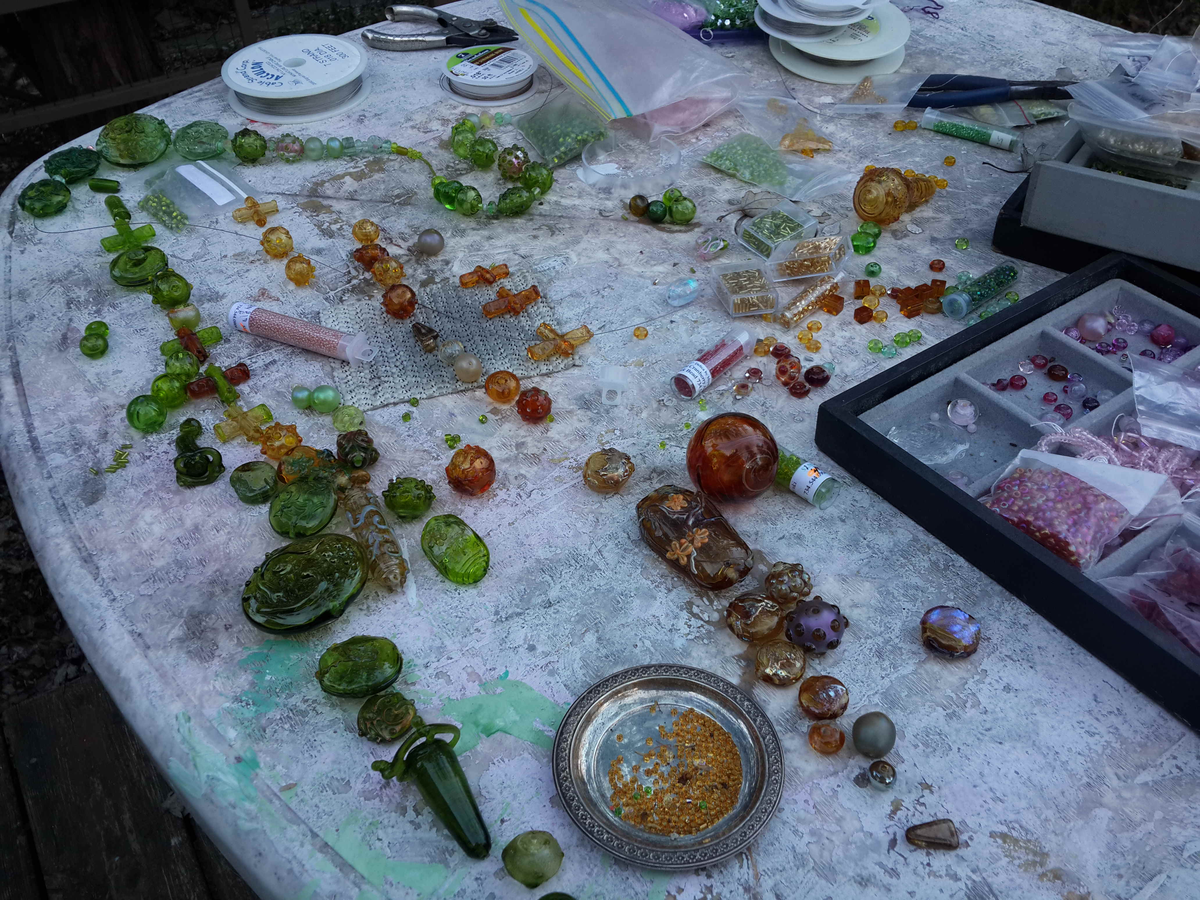 My notes for this period are incomplete—iirc, I mislaid the studio notebook, wrote notes elsewhere, then lost/discarded them, but some online research indicated that it was unseasonably warm that day (over 60 degrees—I was very worried about the cherry crop) so yes, I really was sitting on my deck in the middle of February, stringing beads.