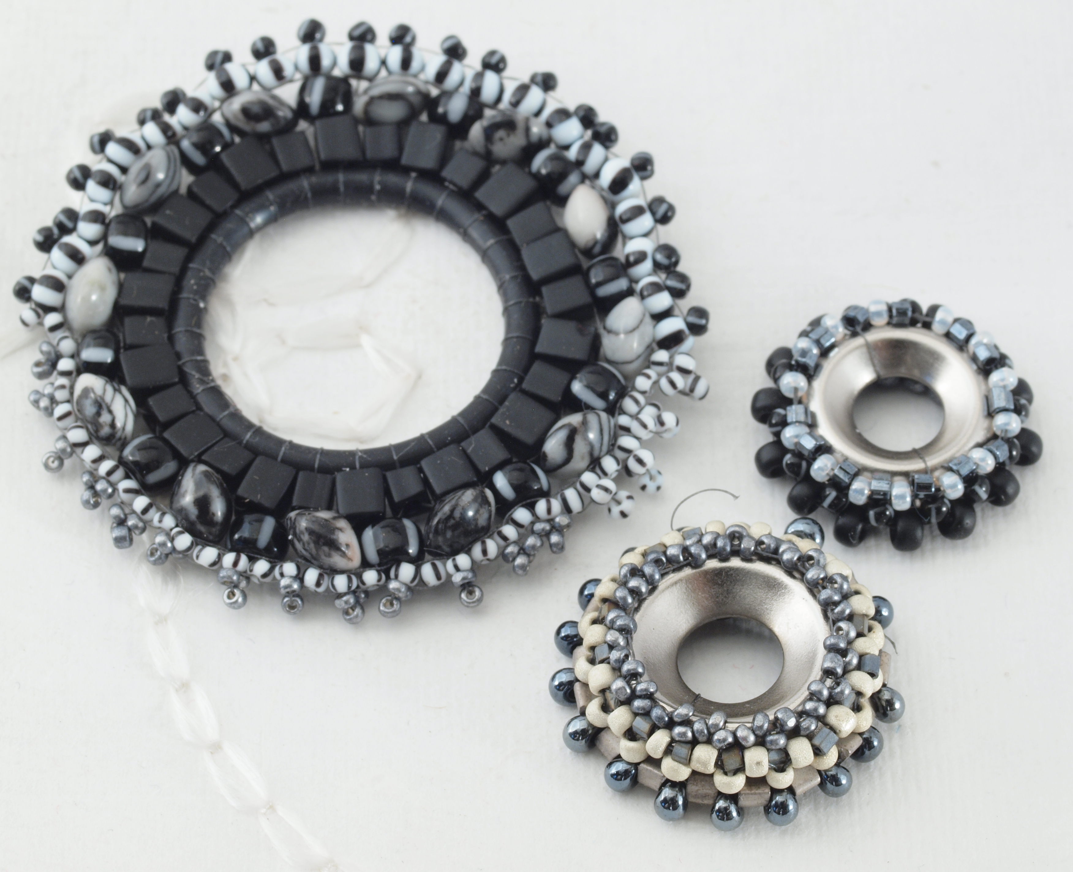 three beadwoven washers. Roughly 20, 24 and 50mm in diameter. December 2011. Steel washers, assorted seed beads, fireline. Just for kicks I photographed the beadwork on a scrap of embroidered paper, to provide a subtle texture. I'm actually pretty happy with the photography.