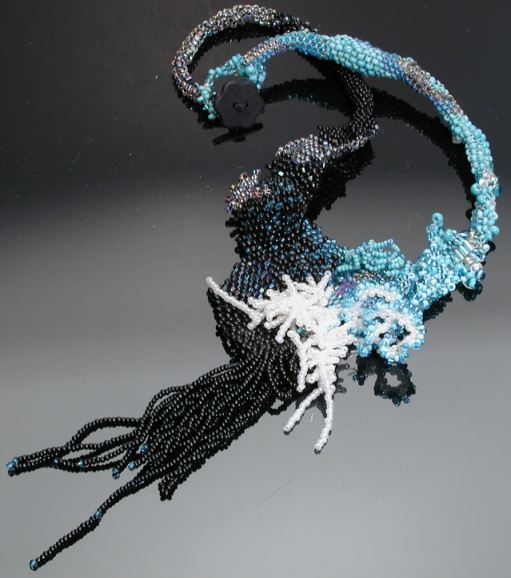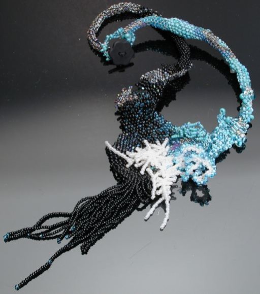 I like the effect, but it's more suited for large areas of transition, so I reverted to the color blocking for smaller areas, such as the sides. I also continued to experiment with some sculptural effects, and fringing: note twisted black fringe and coiled peyote (white with blue edging, just to the right of the white fringe).