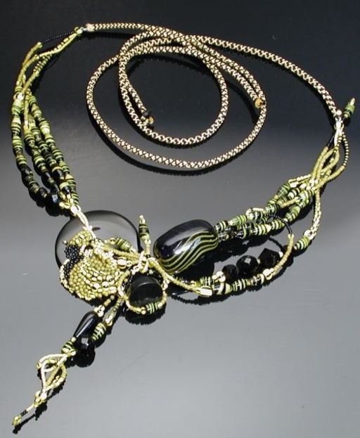This piece was a very long time in the making: the large, yellow striped black bead that serves as the secondary focal point dates back to approximately 1985. Often, waiting for enough beads for a coherent design to come my way is what takes the longest. I finally got enough sizes of the striped black and yellow seed beads this spring, picking them out of mixed Mill Hill boxes at Minnesota Fabrics. (I really wanted to complete this piece.) In between I purchased the oval black and yellow striped wire wound beads and was given the 10stripe 11/0s by Barb Davis “Bent Needle”. Her gift is what finally sparked my interest and inspired me to find the last beads I needed to make the piece.