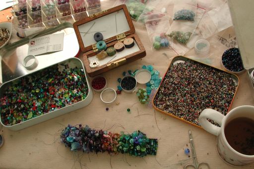 In fact, since this event was scheduled weeks or months ahead, I had many opportunities to buy beads for this project, and got some from as far away as Minnesota and Texas. If I'd bought the kit, I think it would've been $60 or $90. As it was, I think I stopped counting after $300 or so worth of flower and leaf beads. Of course, this way I got to make much bigger, richer looking fringes, to the point where the sides of the bracelet curl under itself. Oopsie.