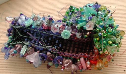 Prairy Wildflowers, my term for the ‘carpet of flowers’ or ‘shaggy caterpiller’ or any number of other names for this simple bracelet is just a brick-stitch band with a dangle stitched through every base bead—sort of like a persian carpet, I guess. At any rate, one of the glassact board members had taken a class and offered to teach us the technique, as sort of a present to us.