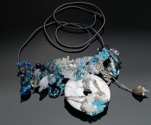Closeup, dark side. The kit came with lots and lots of different kinds of beads, so necessary to this freeform technique, but of course, I couldn't help adding a few more–freshwater pearls, sterling tubes, rounds, and shapes, 15/0s in matching colors. One view shows the white side of the piece; the other substitutes mostly black, to give two different views.