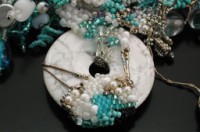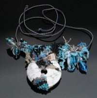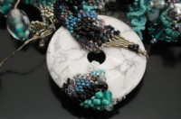 Closeup, above. Gail Frederickson originally came up with this concept when one of her stone donuts broke and she built a necklace to cover the epoxy joins. I was enchanted, and figured a class would get me to practice the relevant techniques, and be social. Besides I might actually learn something.