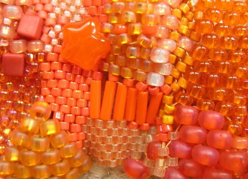 I love being a card-carrying member of the purple and green fan club, but it's awfully nice to find people who like orange, too. Note how the coating is wearing off some of the beads: Margaret thinks this adds an extra level of interest to her piece, which I imagine is a more healthy reaction than mine would be .