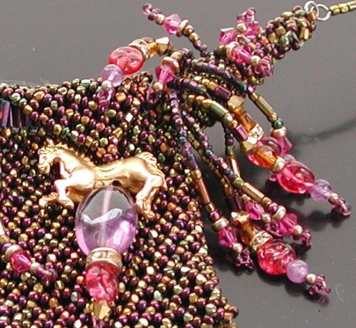 The purse itself is 5-bead netting, and I followed directions for a reasonably successful result. Wanting to play with my success of getting purple, fuscia and gold to work together (a formal color problem I set myself while actively stringing) I brought my own beads, and I think the colors work together fairly well.