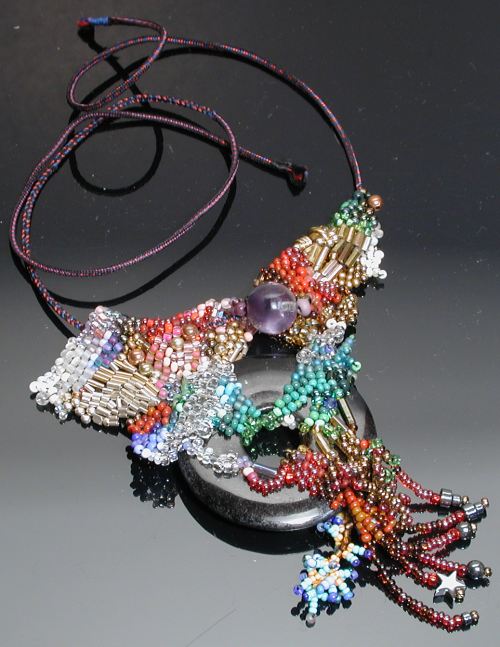 Though I had some experience with peyote, I thought a class would really discipline me to practice, and I loved Gail's donut pieces. Despite all the useful information on fringing (including one I'd never seen before, sort of a corkscrew) the technique I found most appealing was the concept of color blocking: putting clumps of the same or similarly colored beads together, rather like a patchwork effect. I had a dish of all the beads I'd collected over the years, which gave me a very wide assortment to practice.