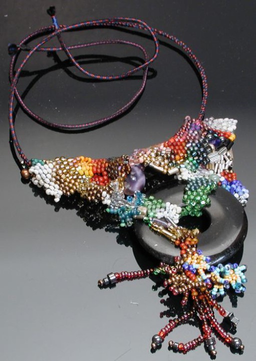 This is the second in a series of two (so far) of peyote stitched necklaces worked around a stone donut, or pi. I can't claim any credit for the basic concept, which was developed by my friend Gail Frederickson who, as it happens, was in a similar coil over a broken donut. She glued the thing back together, covered it with some beadwork, and turned it into a class.