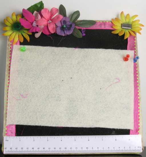 Macrame board. Doubled foamcore, fabric, felt, paper, pushpins, silk flowers. 2008, Kathleen Robinson, with additional decors by yours truly.