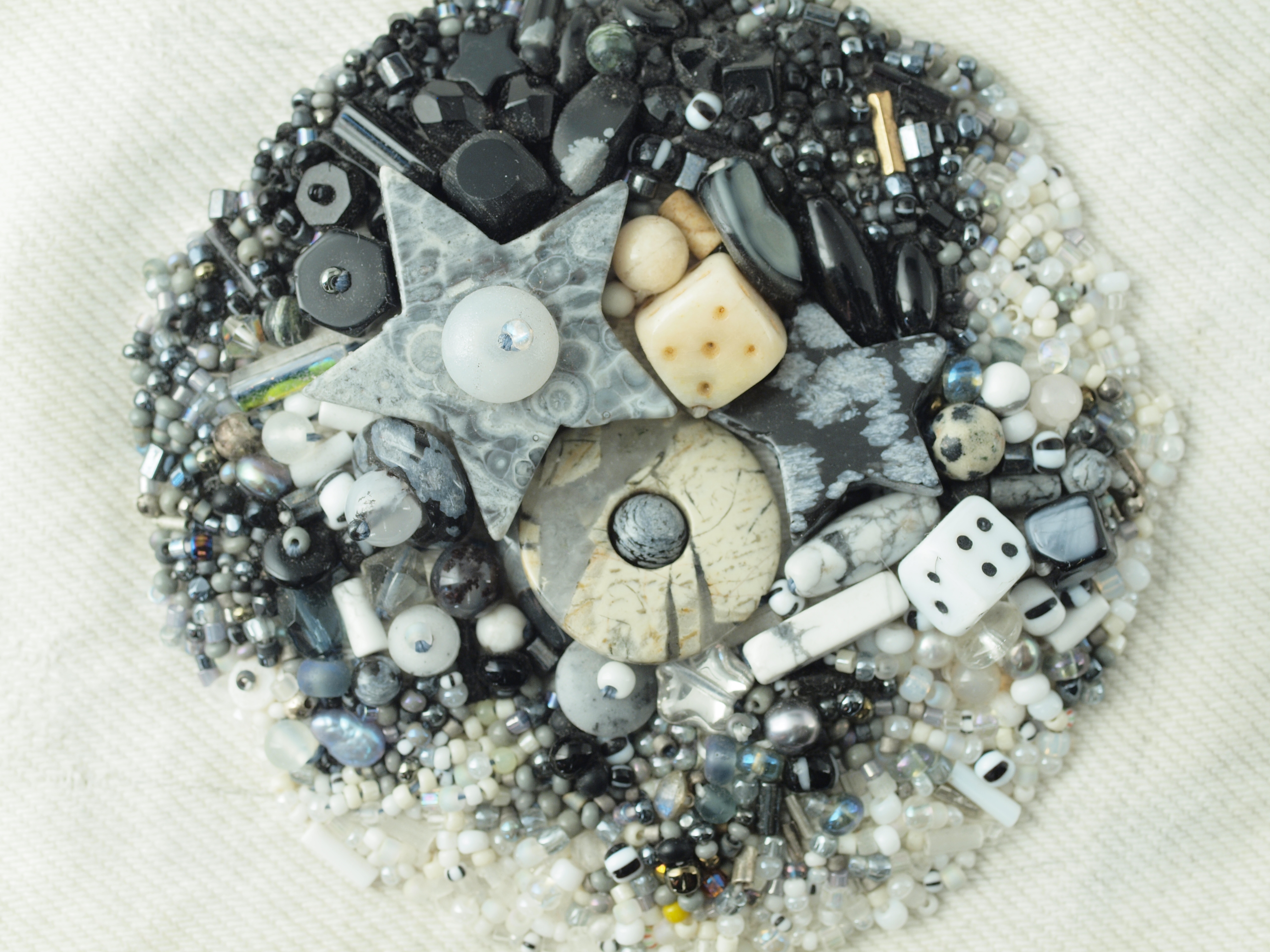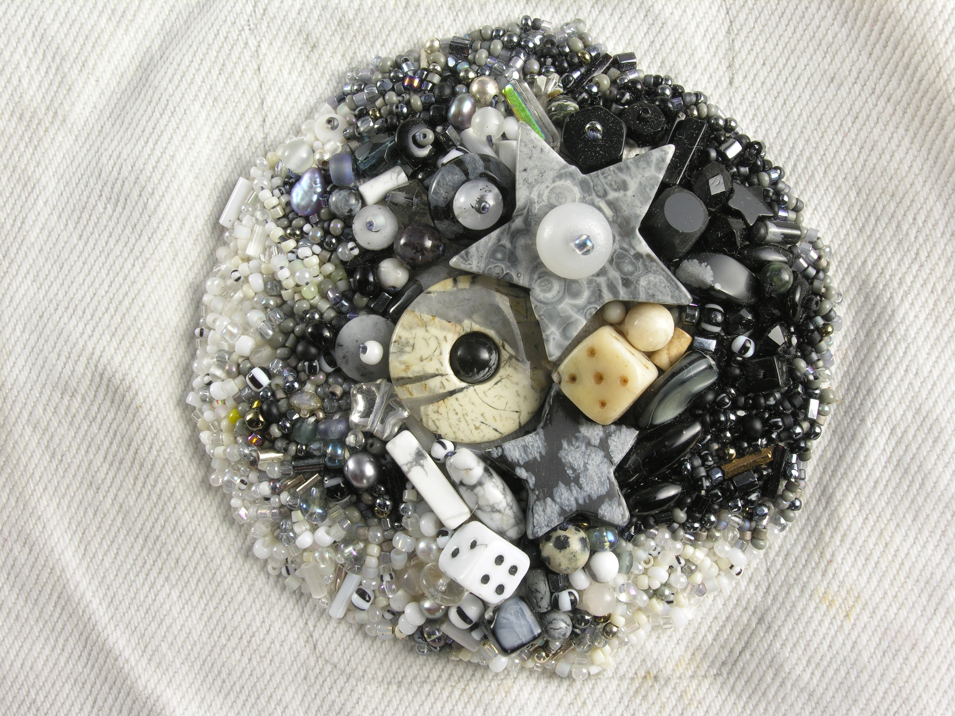 MATERIALS: The piece includes snowflake, picasso, and woodland jasper; tree (dendritic) agate; hematite; blackonyx; vintage glass, czech pressed glass, artist made hollow beads —there's a pixie dust one centered on the hole of the big snowflake star—, bone, including bone die (as well as a glass one), sterling silver, and of course many seed beads. It's stitched onto white denim.