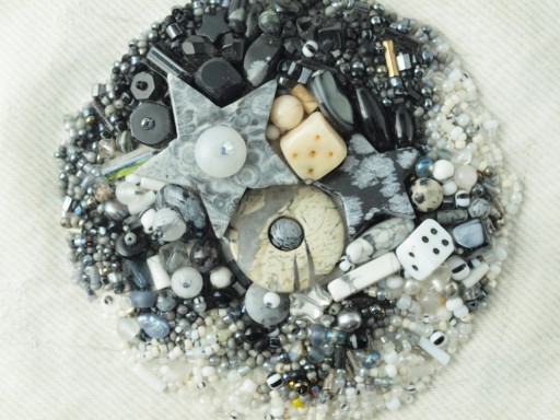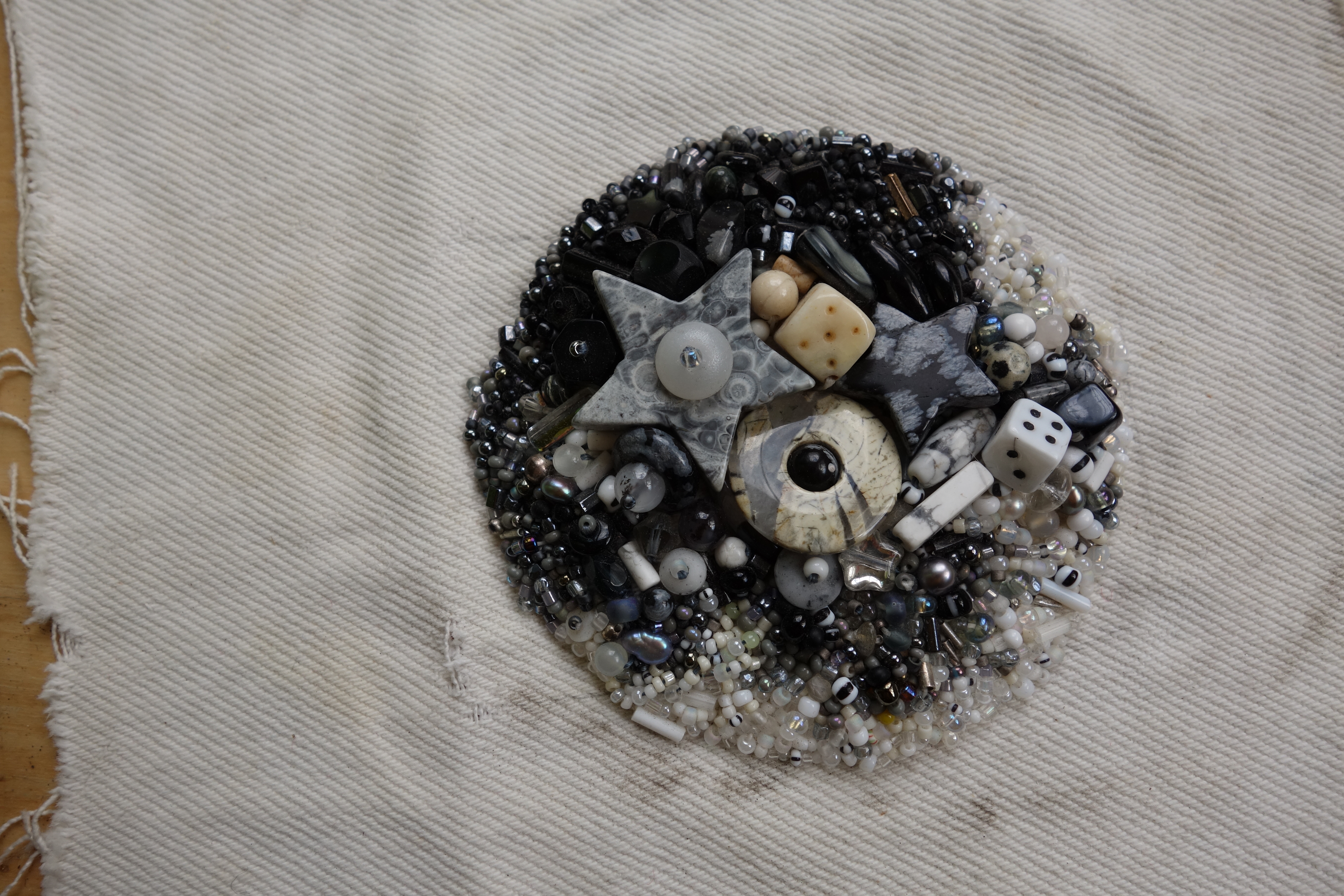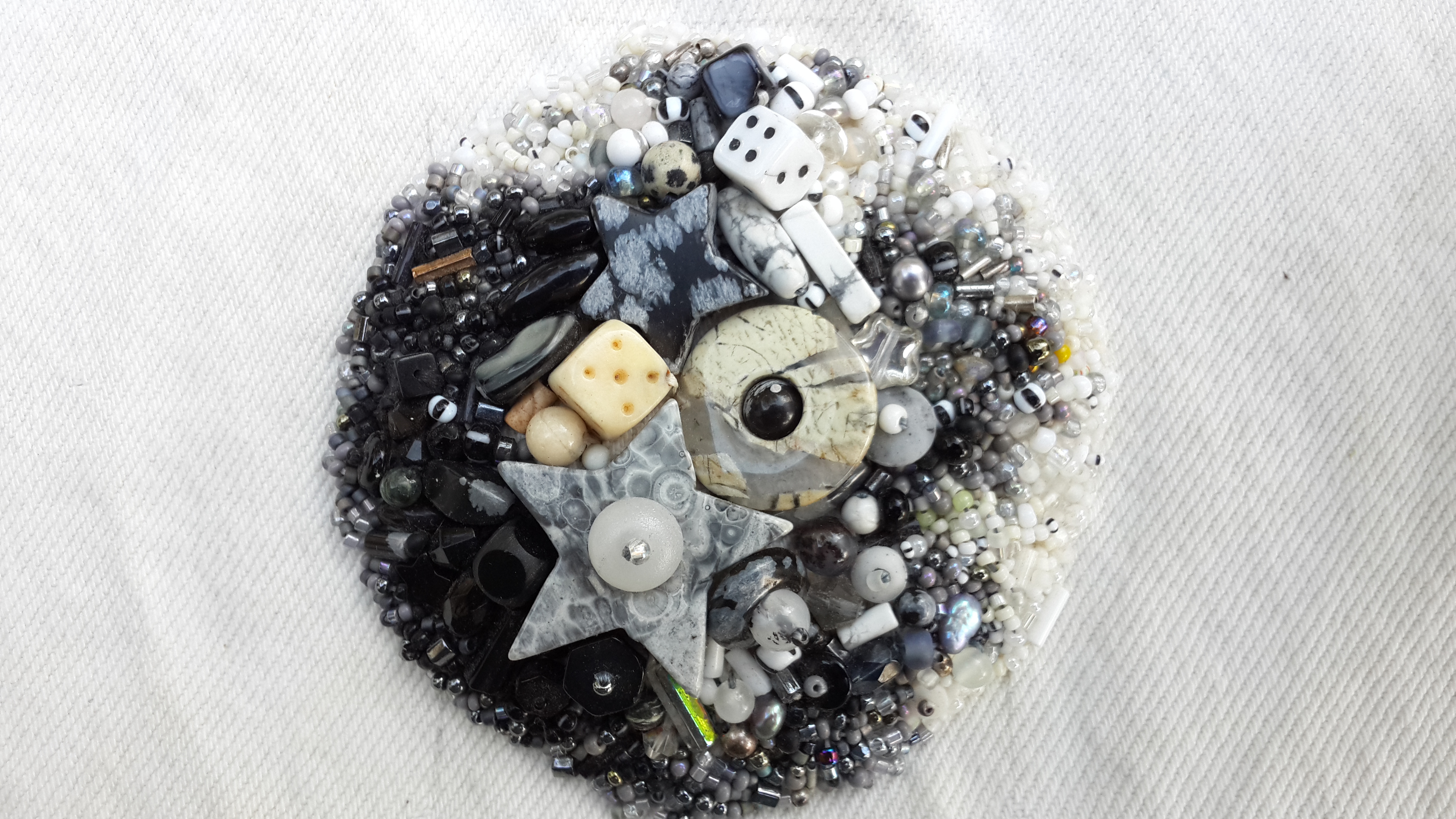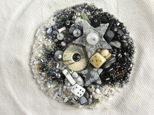 So the next piece I made (as I recall, and photographic evidence seems to support my chronology) after the pastel bead embroidery was this black, white, grey and cream piece which remains a favorite.