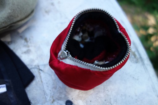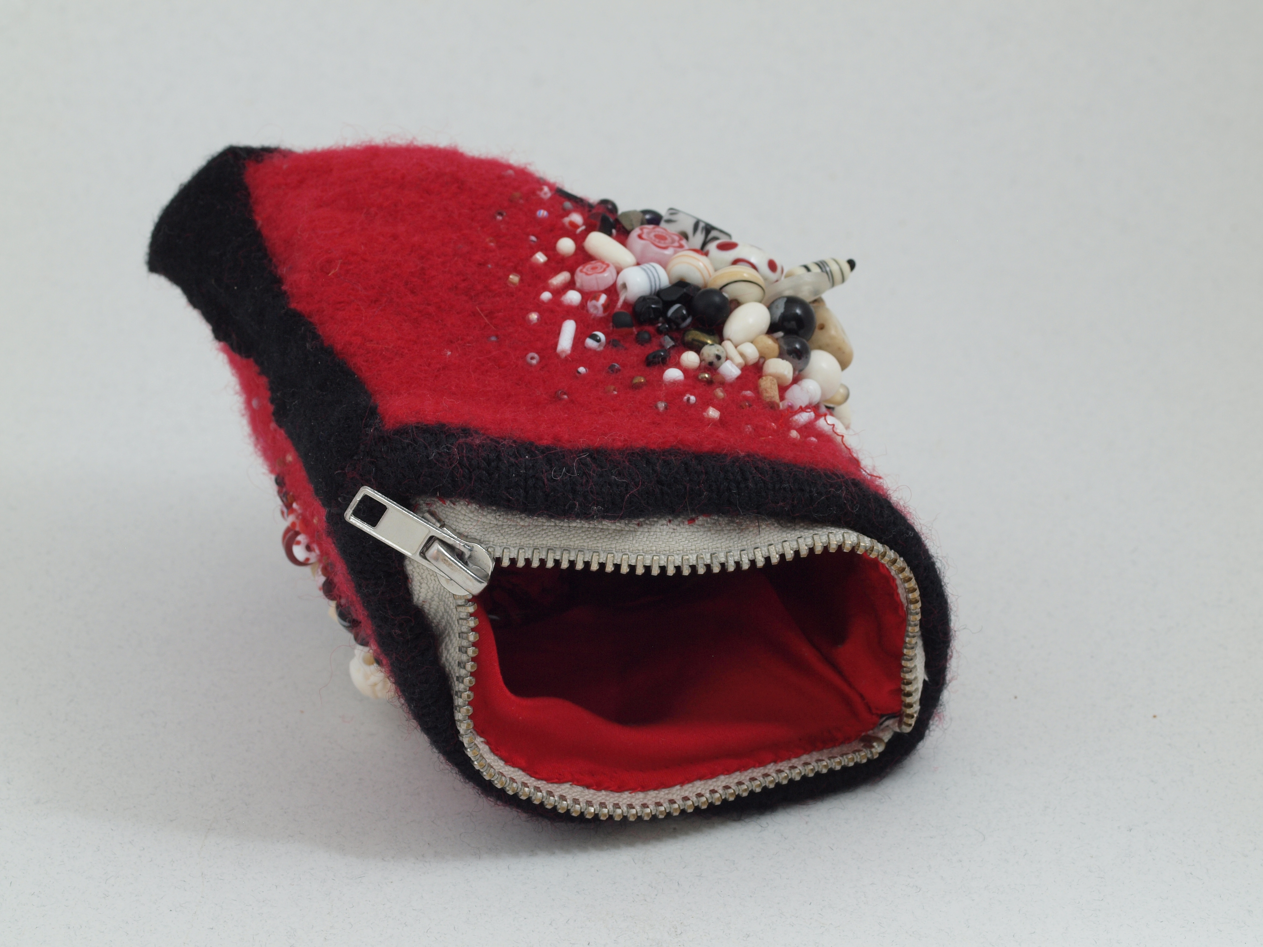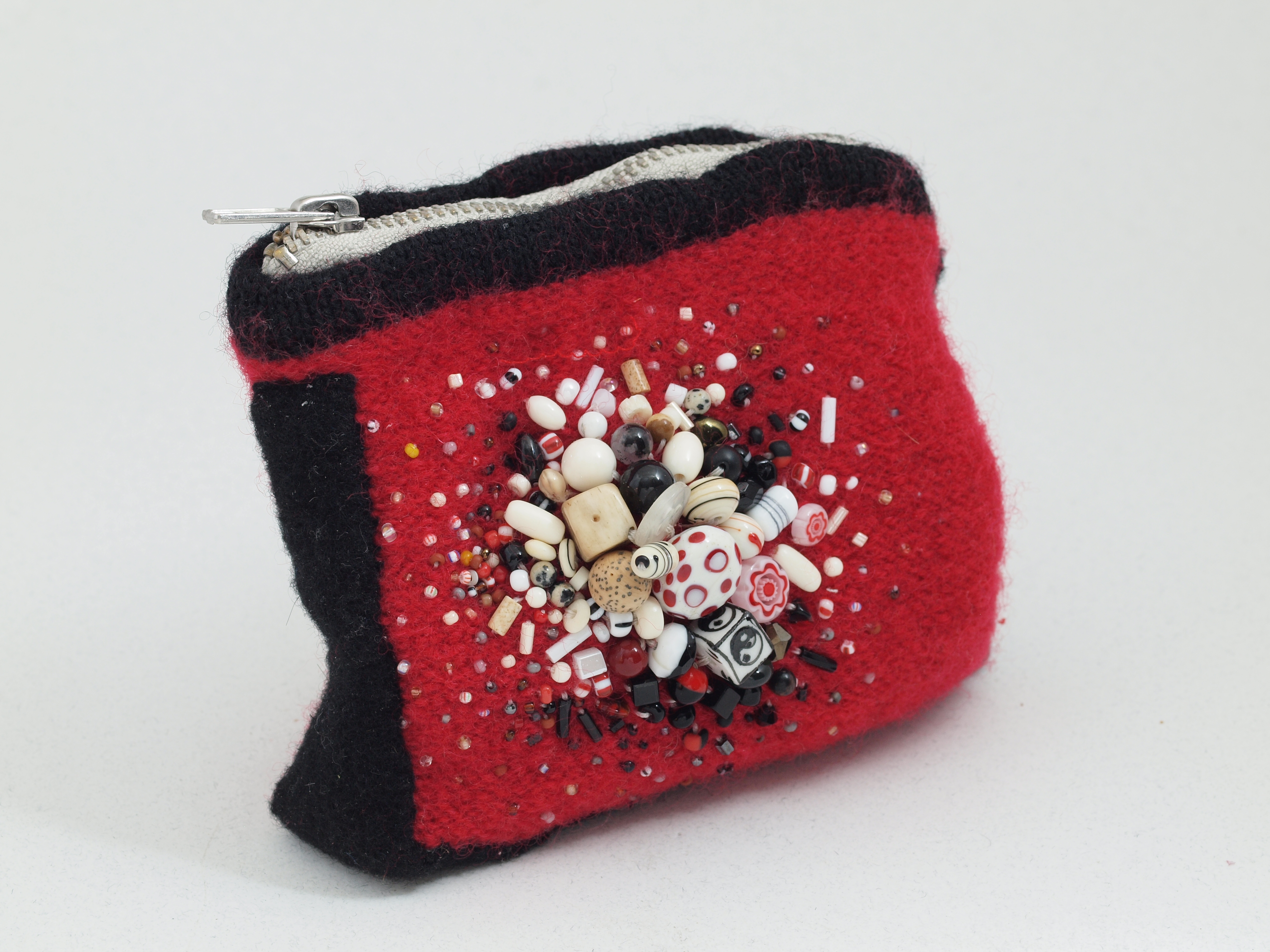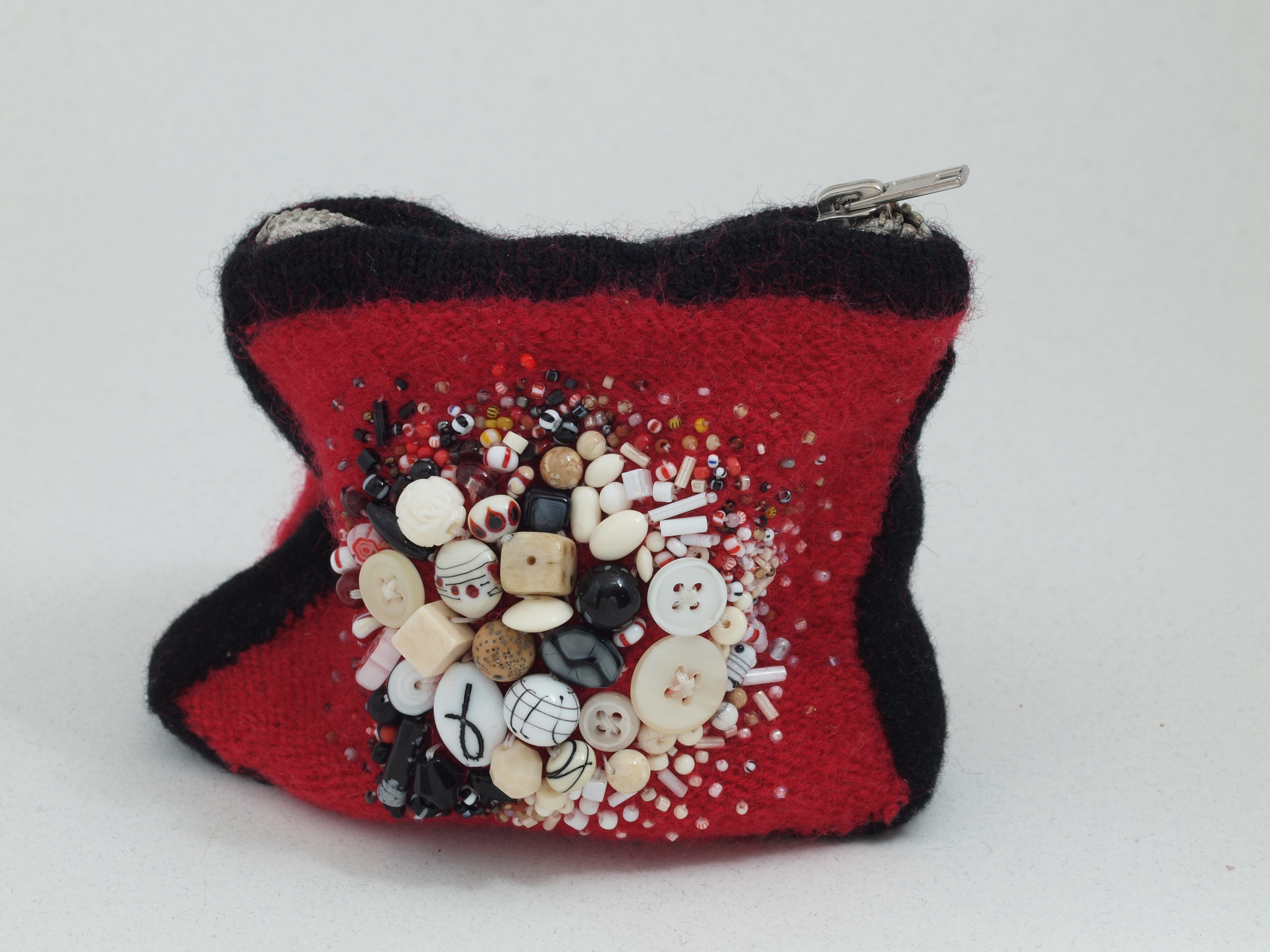 2nd in a series of boiled red wool pouches. 4.5 h x 5 w x 1.5" d (measured from tip of projecting beads on each side.) Olympus, zuiko macro, flash, 14sep15. Click on any image for a full-size view.