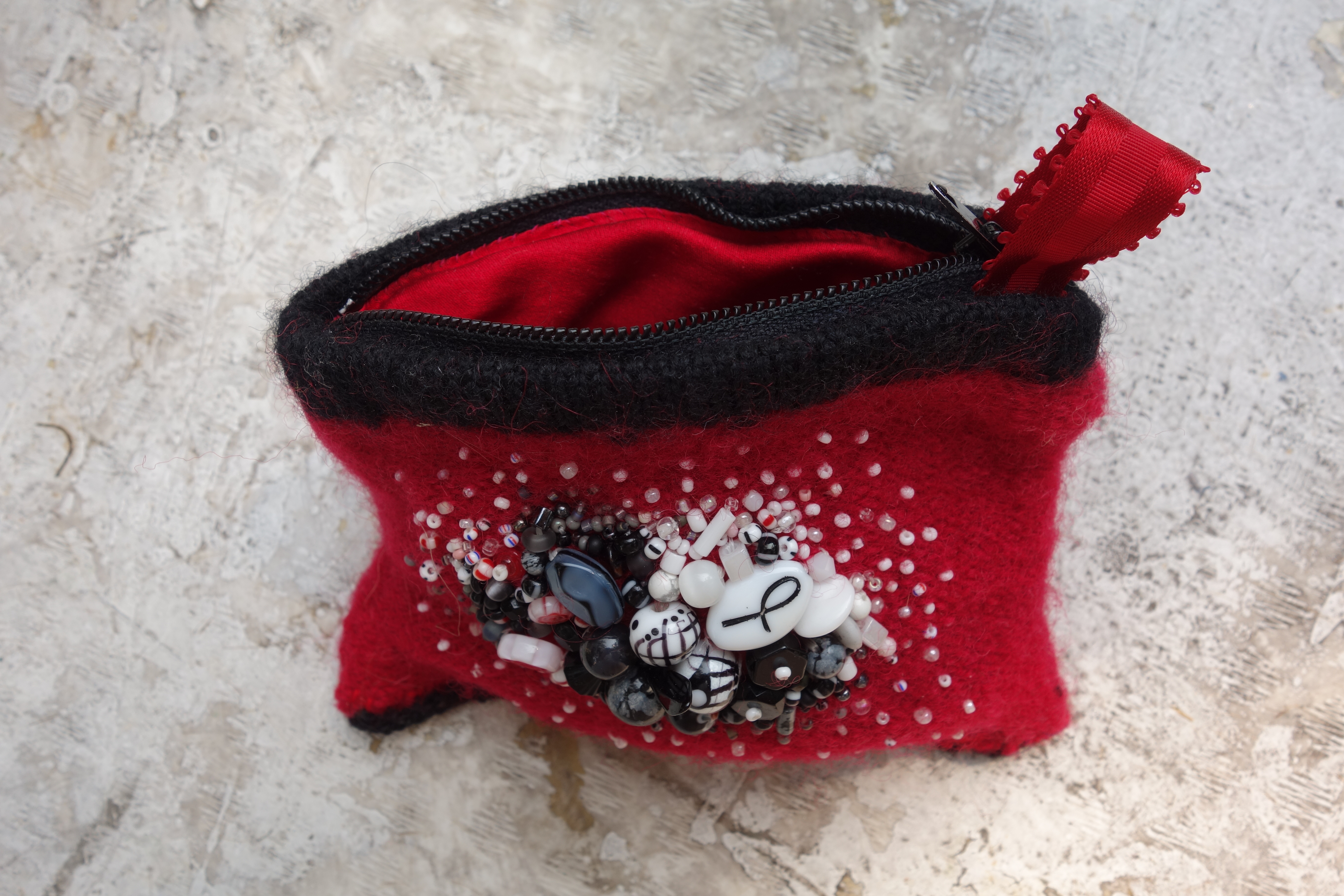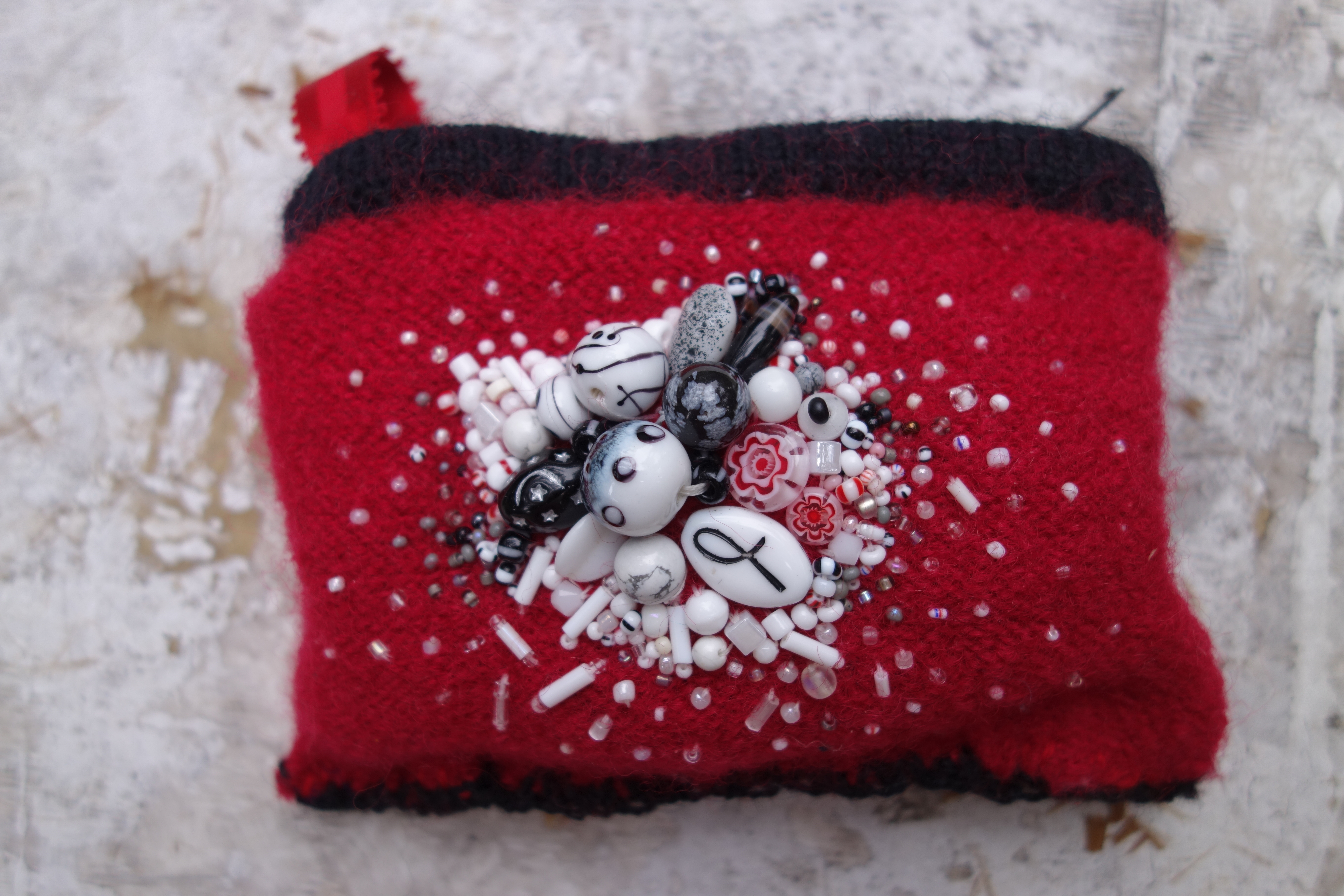 Like the rhyolite/unakite pouch that started this series of beaded embroidery posts, the red, black and white necklace I made in July also yielded lots of leftovers, especially lampwork. I had a felted sweater in just the right colour, and I reasoned that nice thick, softly felted wool would be both strong and easy to embroider—and like my stockings, wouldn't even require me to use an embroidery hoop! I also started incorporating what I thought of as the“sprinkling technique” that I first started using the brown silk pouch.