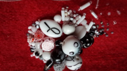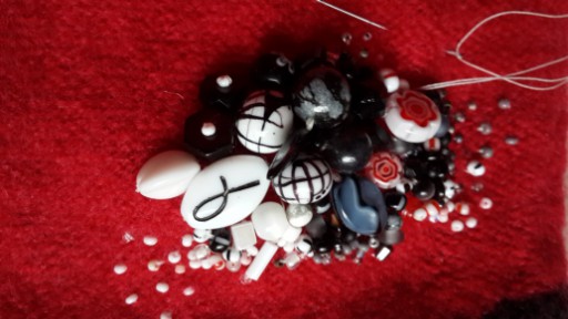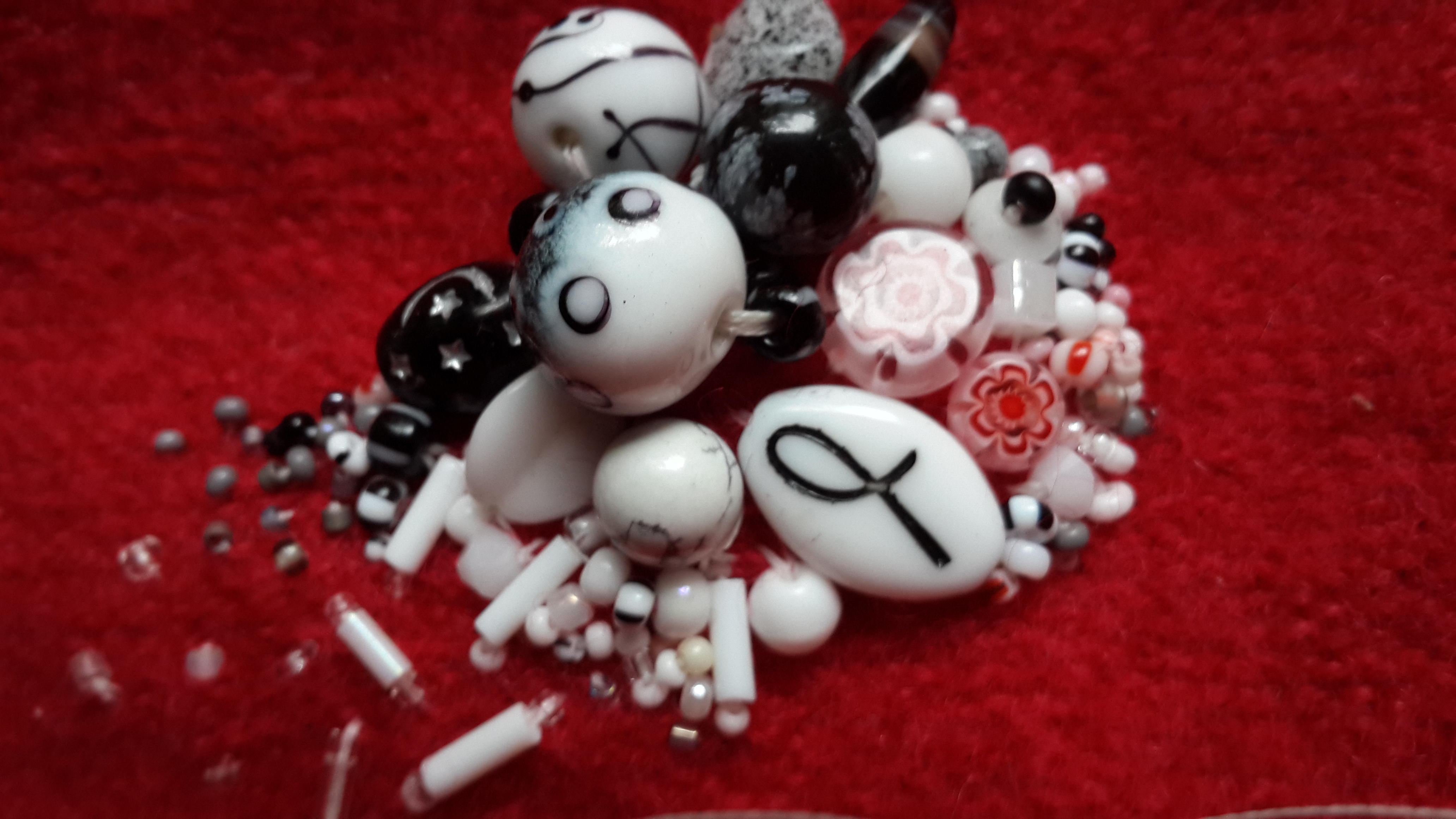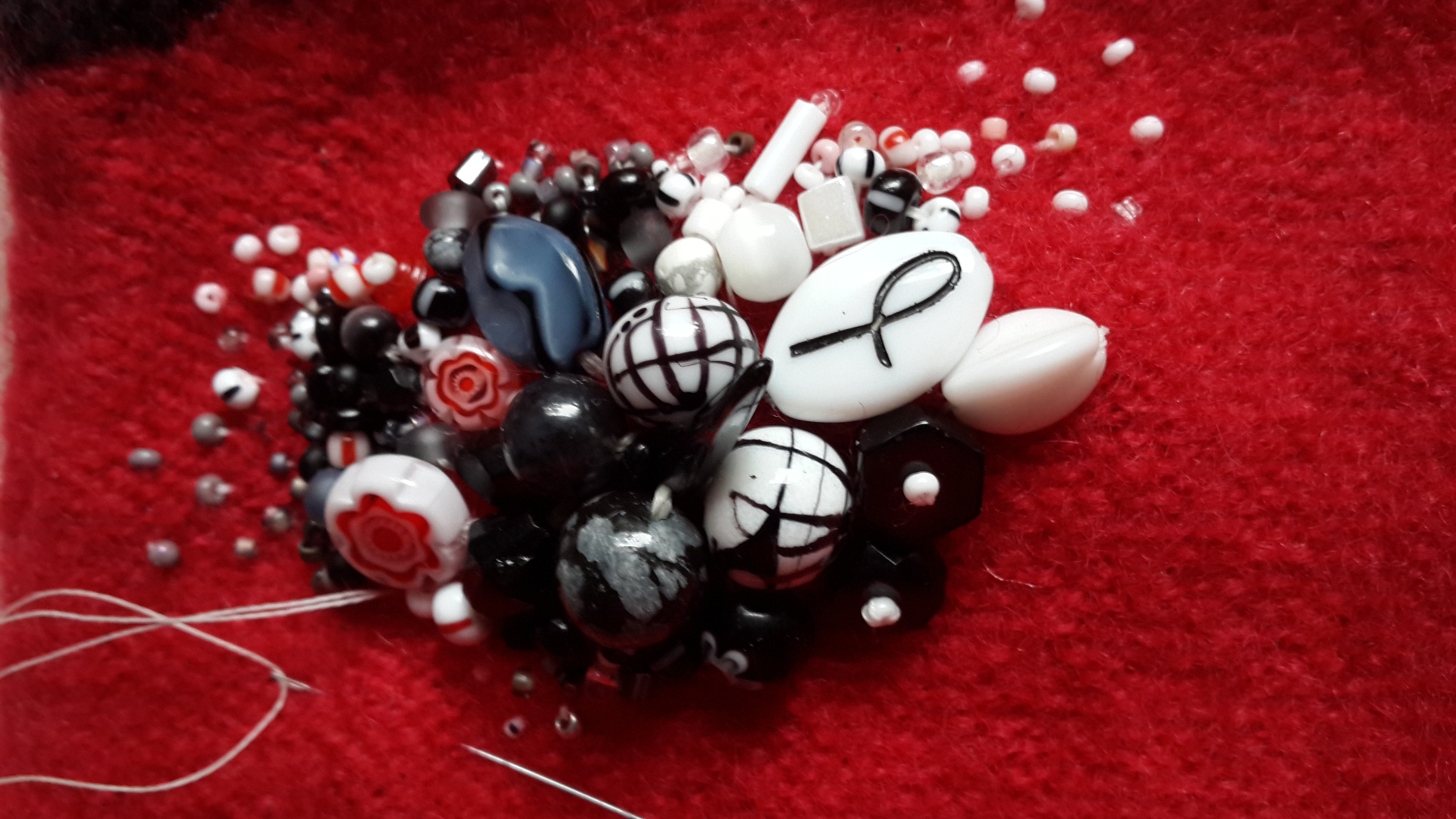 In progress. 03 August 2015. Howlite, snowflake obsidian, artisan lampwork, pressed/vintage, shell, swarovski, seed and bugle beads. Nylon thread on red and black wool.