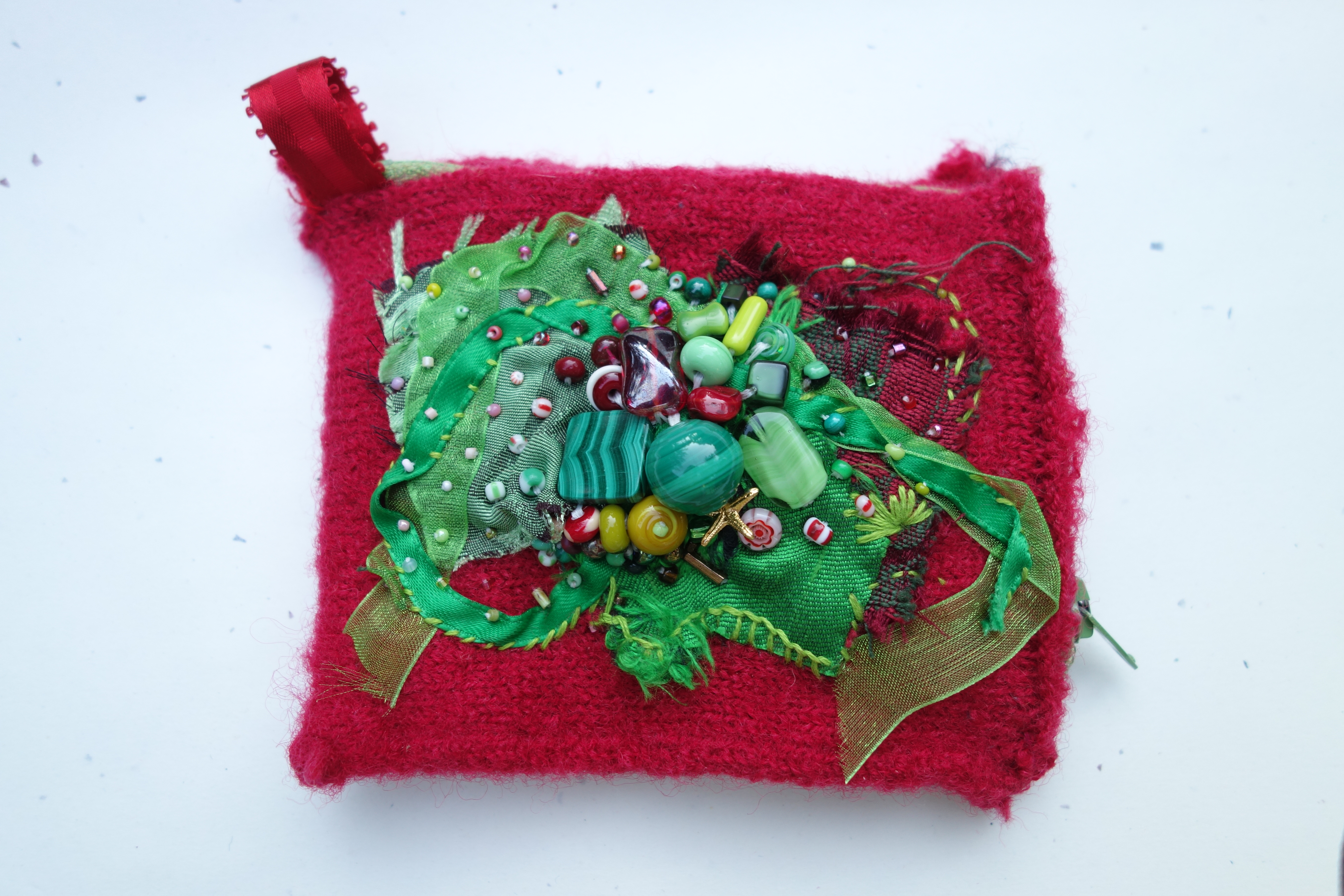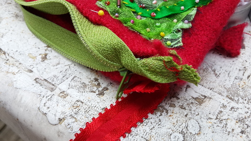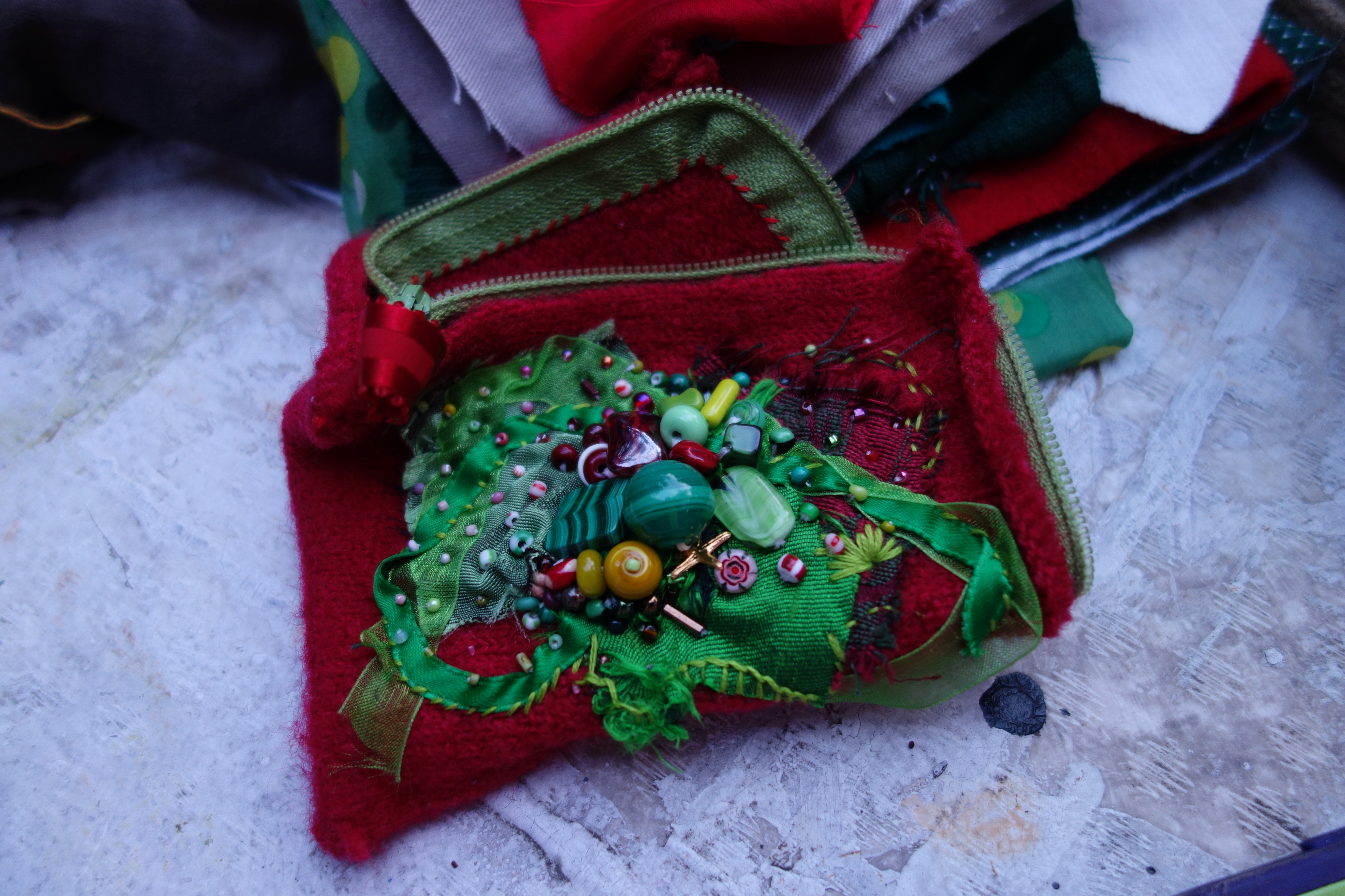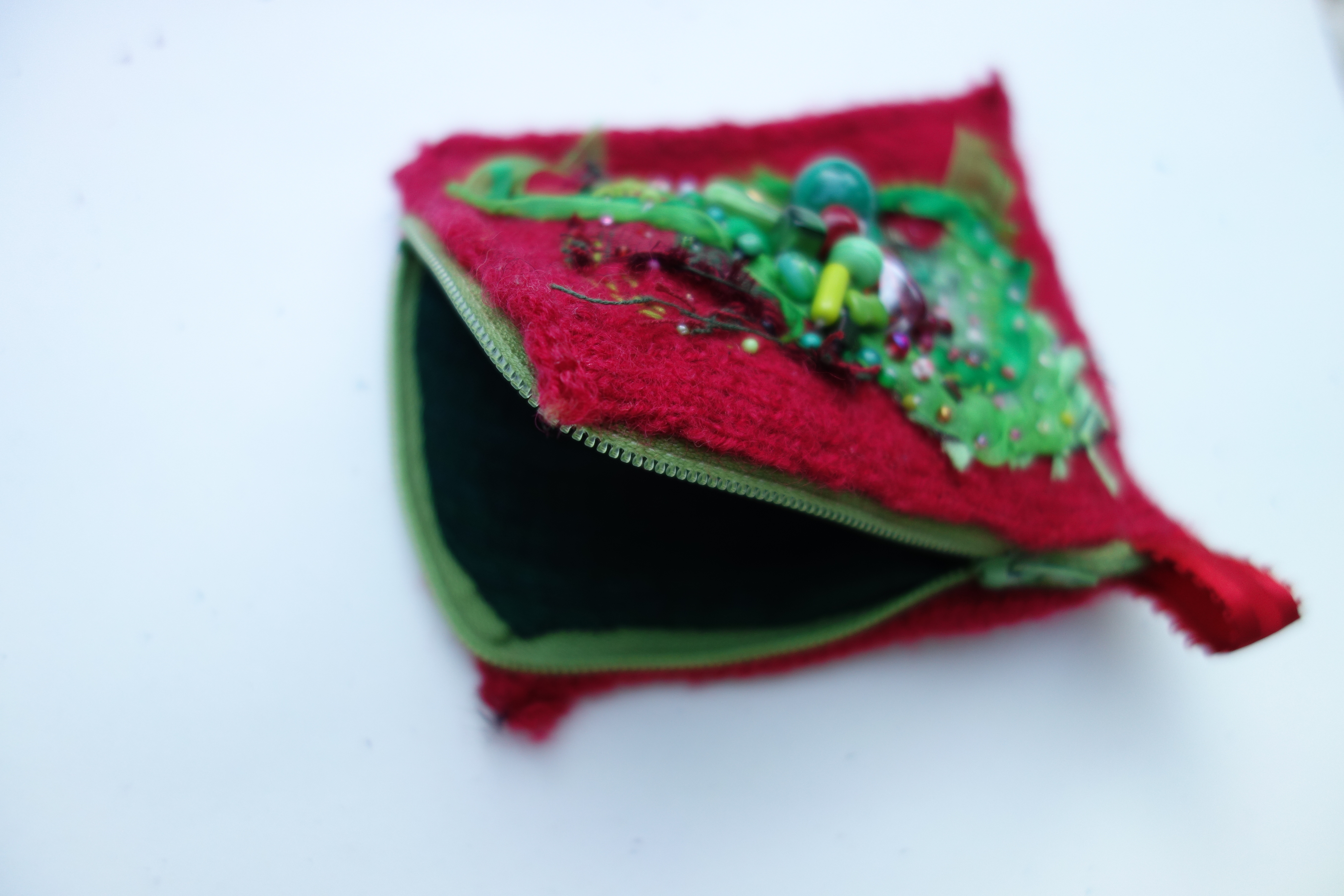 Open. Same dark green silk lining. Red wool, silk, ribbon, glass beads Started 07sep15, completed sometime by 17sep15.