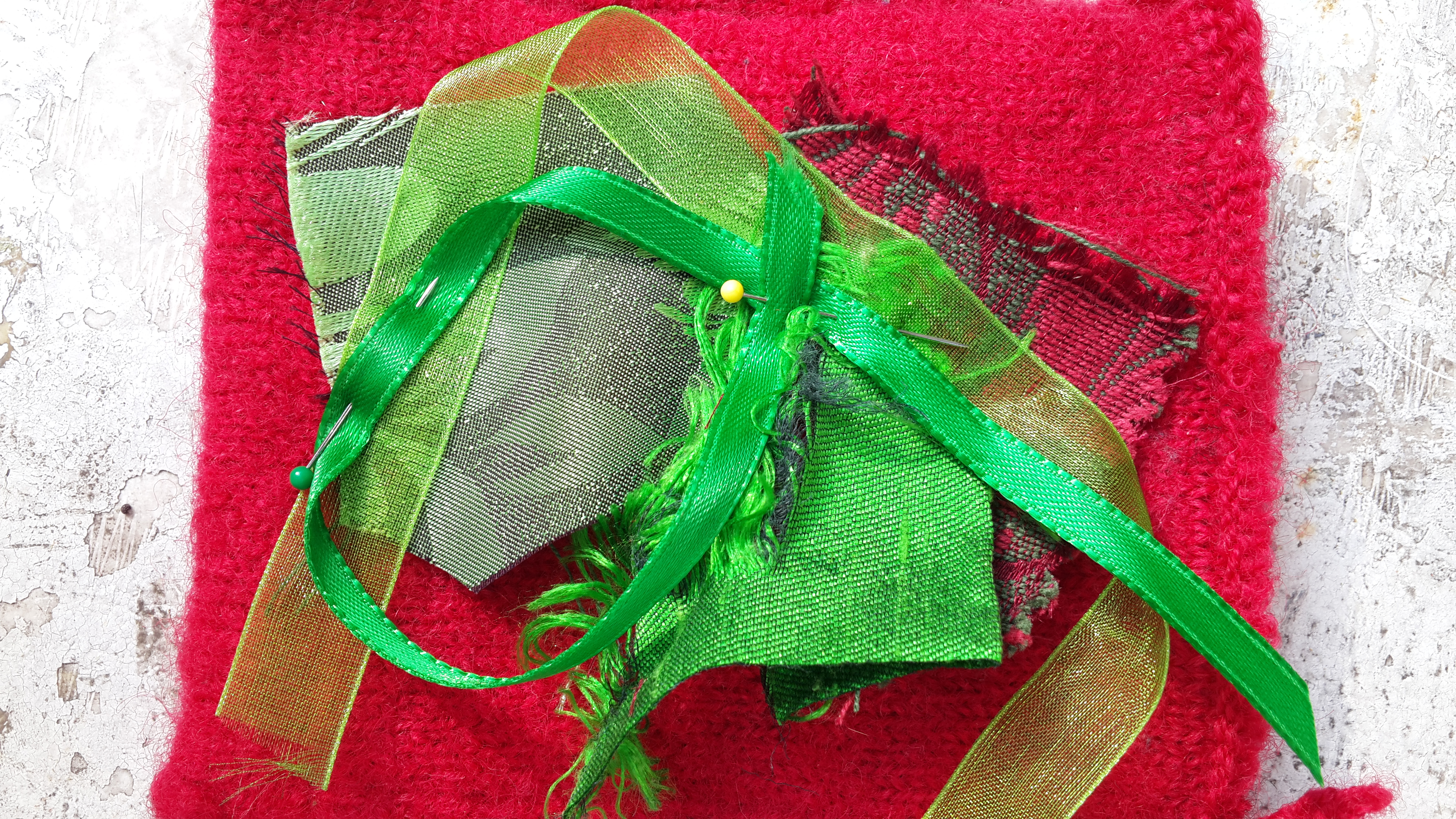 Start by gathering together the fabric for the bag, lining and zipper. Select some co-ordinating or contrasting scraps—in this case, bits of silk, tapestry sample fabric and ribbons.