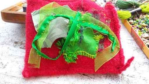 Unlike the first two pouches in this series, these are embroidered only one side, and include scraps of fabric applique. This one as a better ribbon loop insertion.