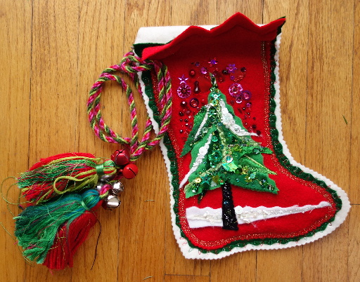 It's good to have an extra stocking or two, for those folks who've forgotten theirs (or might not have been associated with the family long enough to get their own, since it takes me, on average, about 3 years to make one.) I happen to especially like pine trees—they're a fun, easy shape, in xmas colors (green and white) plus, yanno, I like green and have a lot of green beads and sequins.