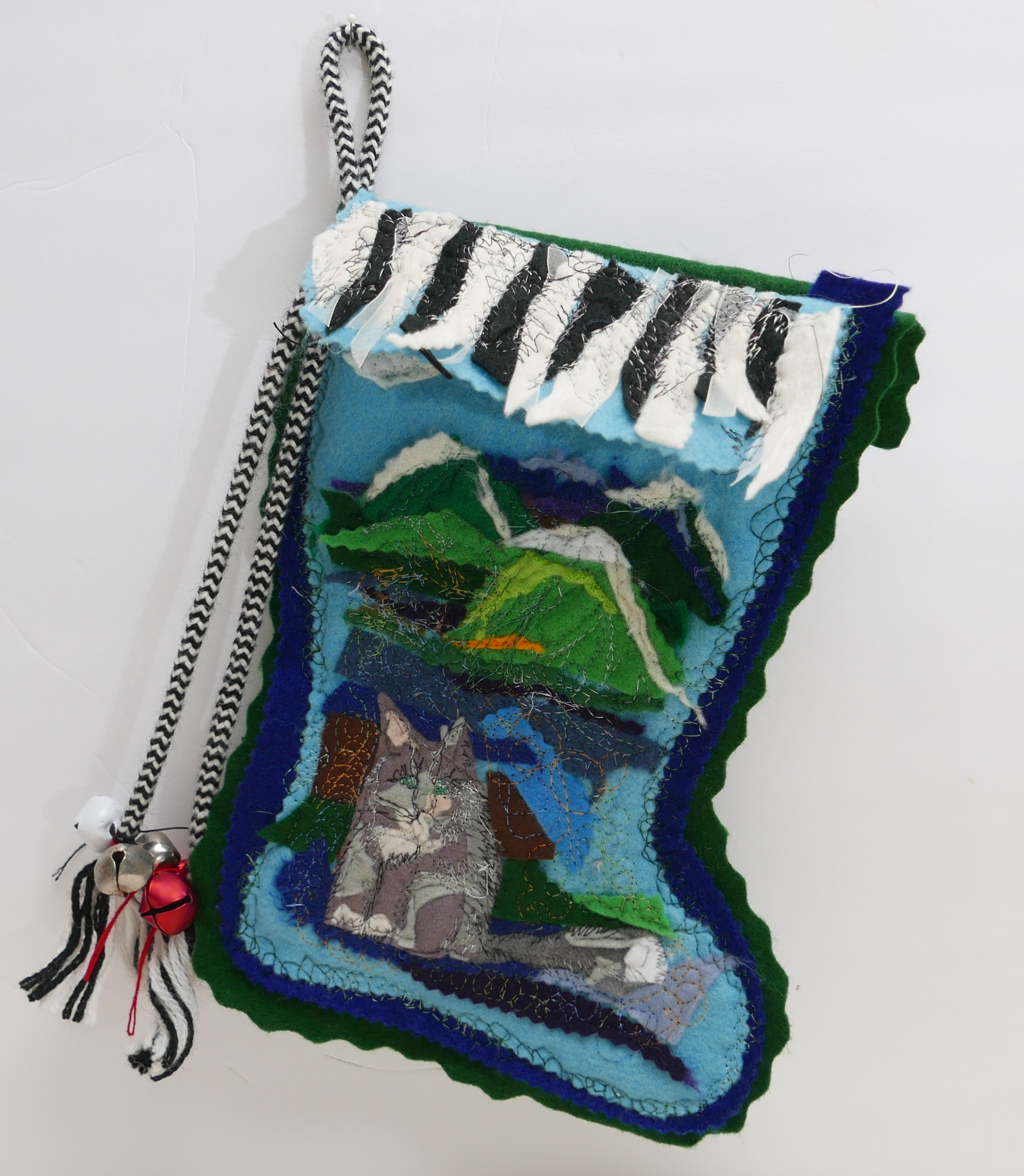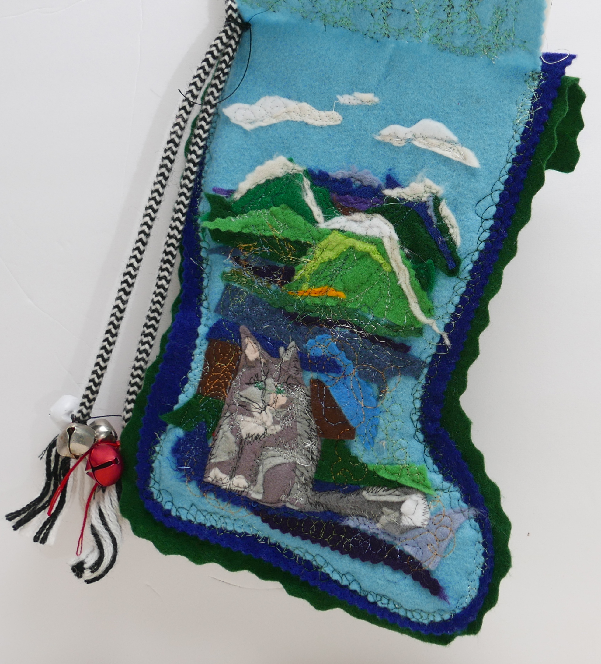 With the flap up, to show the clouds. Assorted nylon, metallic & rayon threads, felt, wool kumi, jingle bells.