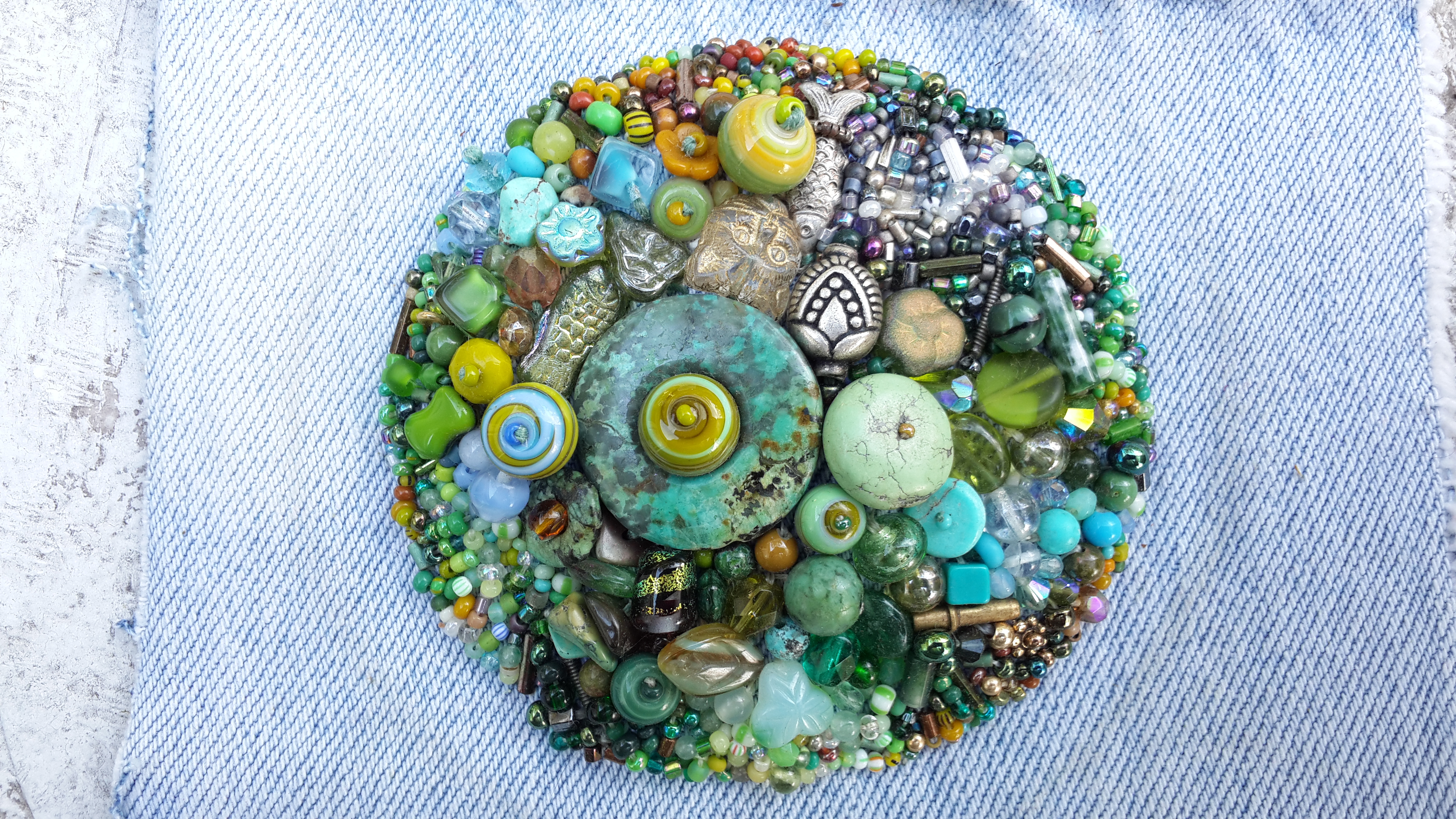 Beaded embroidery on denim. Not sure what the big lifesaver bead is—perhaps low-grade amazonite? There are several unakite and turquoise beads (plus others purporting to be same) but it's not that. Also at least one tree agate, peridot, emerald and Indian (Hindi) silver, sterling, a lot of vintage glass, seed beads, plus of course some of my own beads, mostly stripies.