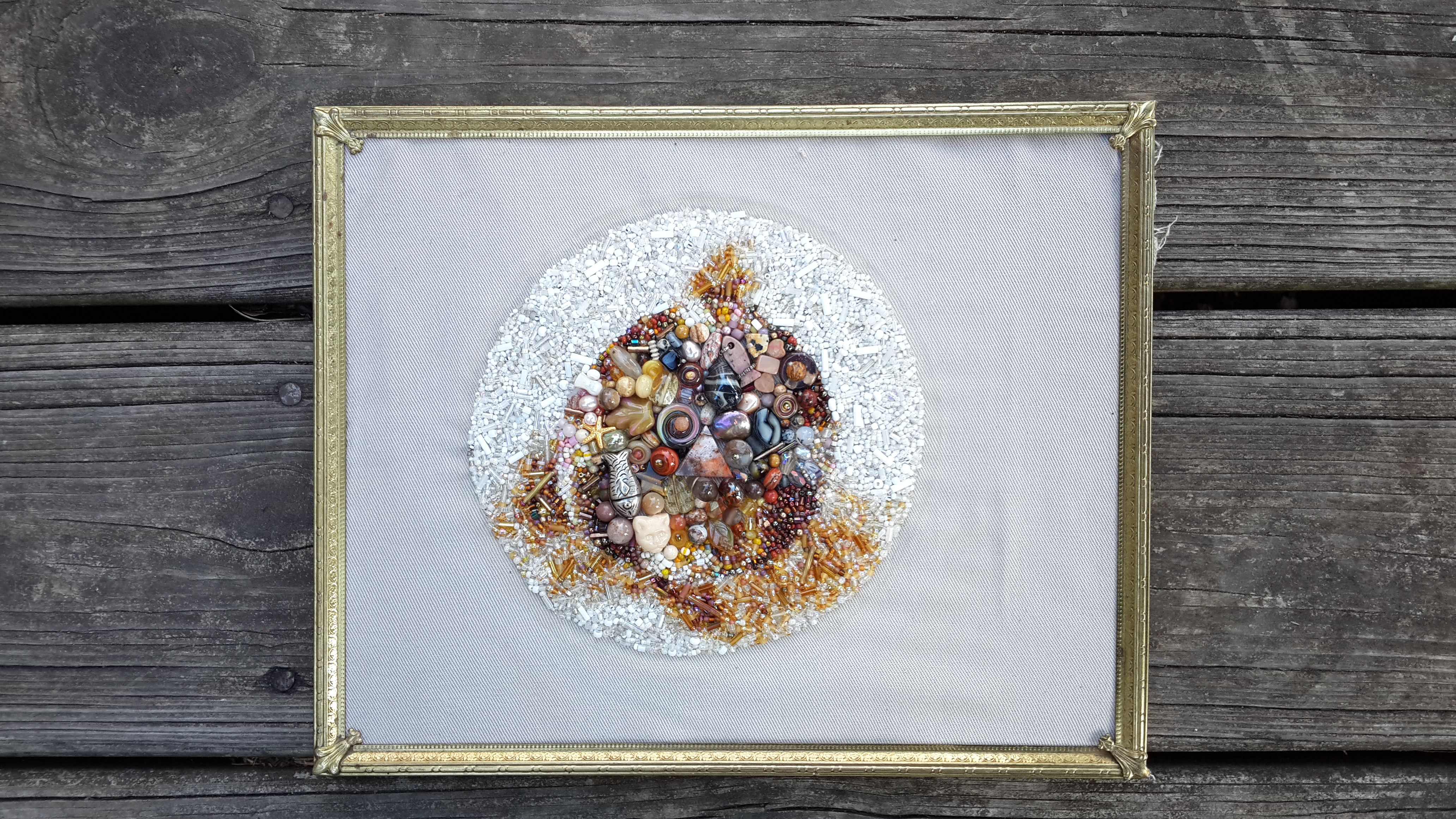 I enjoyed embroidering all the little beads, but it took forevah. Also, what was I to do these relatively large scale objects? (It didn't really occur to me to frame them until a year or two later, and they're not well framed.) I wasn't crazy about the color scheme, but it made perfect sense for the fabric, and iirc, the season. However, the piece is forever linked to visiting with neighborhood friends, and so has a warm place in my heart.