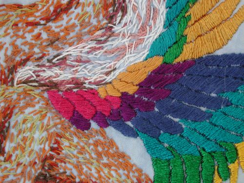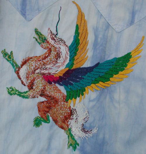 This shirt, which I believe I made in my early college years, was therefore done after Thassar and Catarina, which I did in high school, and the former shows the influence my discover of Needlearts and their varied product lines were having on my pallette: I incorporated Deutsch ‘marlitt’, extremely shiny and silky, for many of the wing feathers (the outer three ranks, gold, kelly green and turquoise—cobalt, purple, fuscia, and mustard are cotton DMC as you can see in the detail, below) which on this beastie were inspired by my concepts of Birds of Paradise.