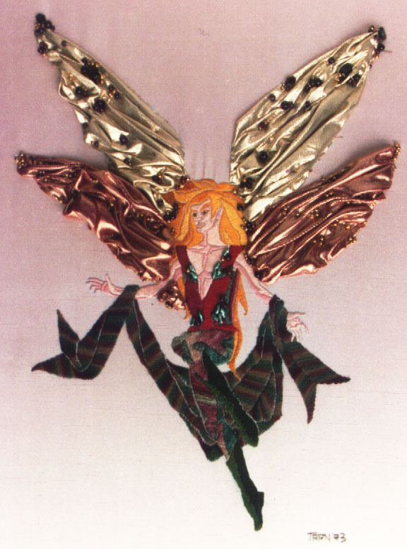 This was another gift, for a friend of mine, who was enchanted by the richness of gold lame, so I incorporated it into this piece. Though the wings decorated with 2 and 3mm metal (brass and 12/20 gf) and 4mm garnet beads are intriguing, they overpower the rest of the piece, which is only 2/3 or so the size of Lady, above. The Brits are great at incorporating lame and other shiny metal things into their embroidery, but it's clear I have a ways to go before I master the effect.
