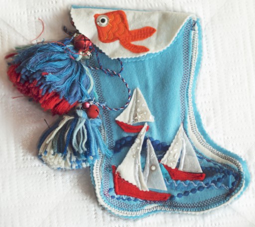 They went through a series of boats, ending with an Etchells 22, an elegant and graceful day sailor. Some years later, on vacation on the western side of Michigan, I saw a fleet of these boats heading out to race: but whether that memory came before or after that stocking I couldn't tell you. But as in the google images most were white. My parents’ was red, which is a christmasy color, so I made all three red which frankly is unlikely; but then so is The Three Kings coming to see Christ Jesus in boats (even in the mythology of Christmas, where they're ‘properly’ depicted on camels, yes?) In any event I combined these two ideas for this stocking, referencing the goldfish that appeared in two of the earlier stockings.