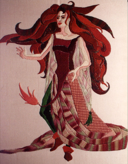 The piece, which my brother requested as a Christmas present, is made with 5 perle cotton, caron overdyed cotton (sleeves, hair), overdyed wool (the underside of the garment, turned up). In addition to the obvious couching on the skirt, there is also the subtle (almost invisible) diagonal couching on her bodice, also a Japanese technique.